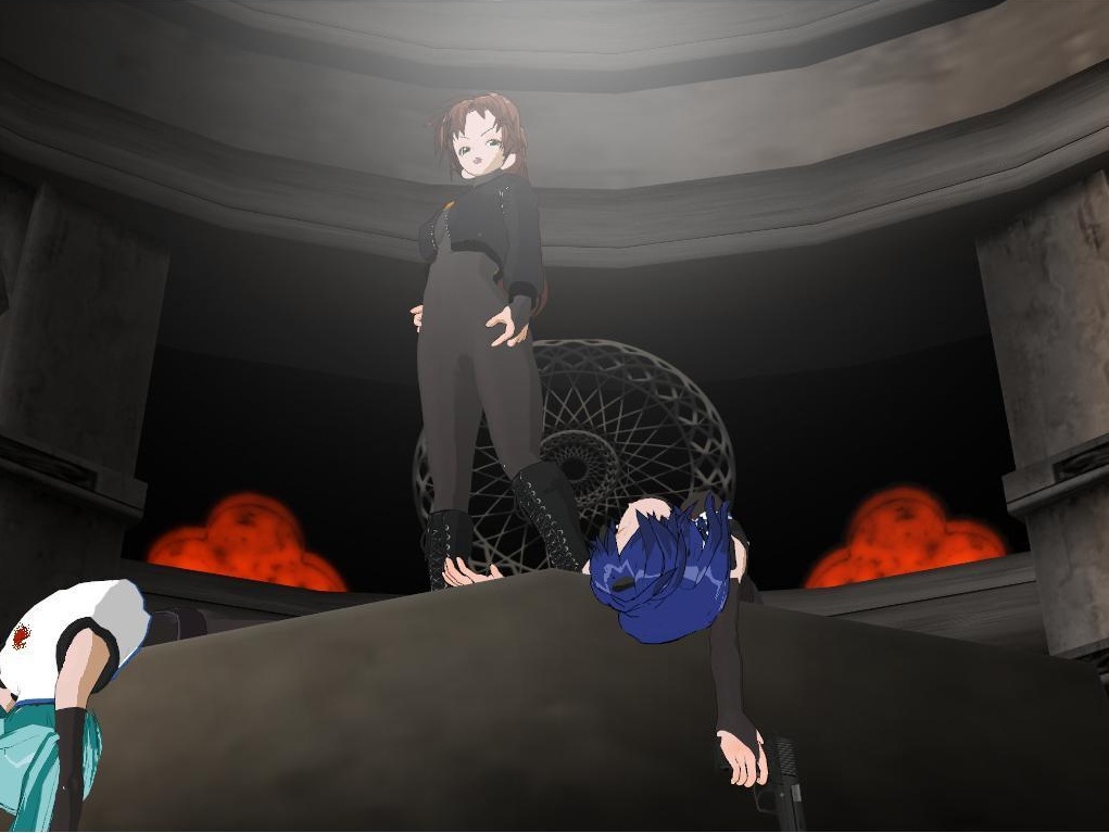 I can see the MMA fighter/kickboxer struggling there, with her black sports bra partially torn and her body bruised. Just one more strike and she's down!