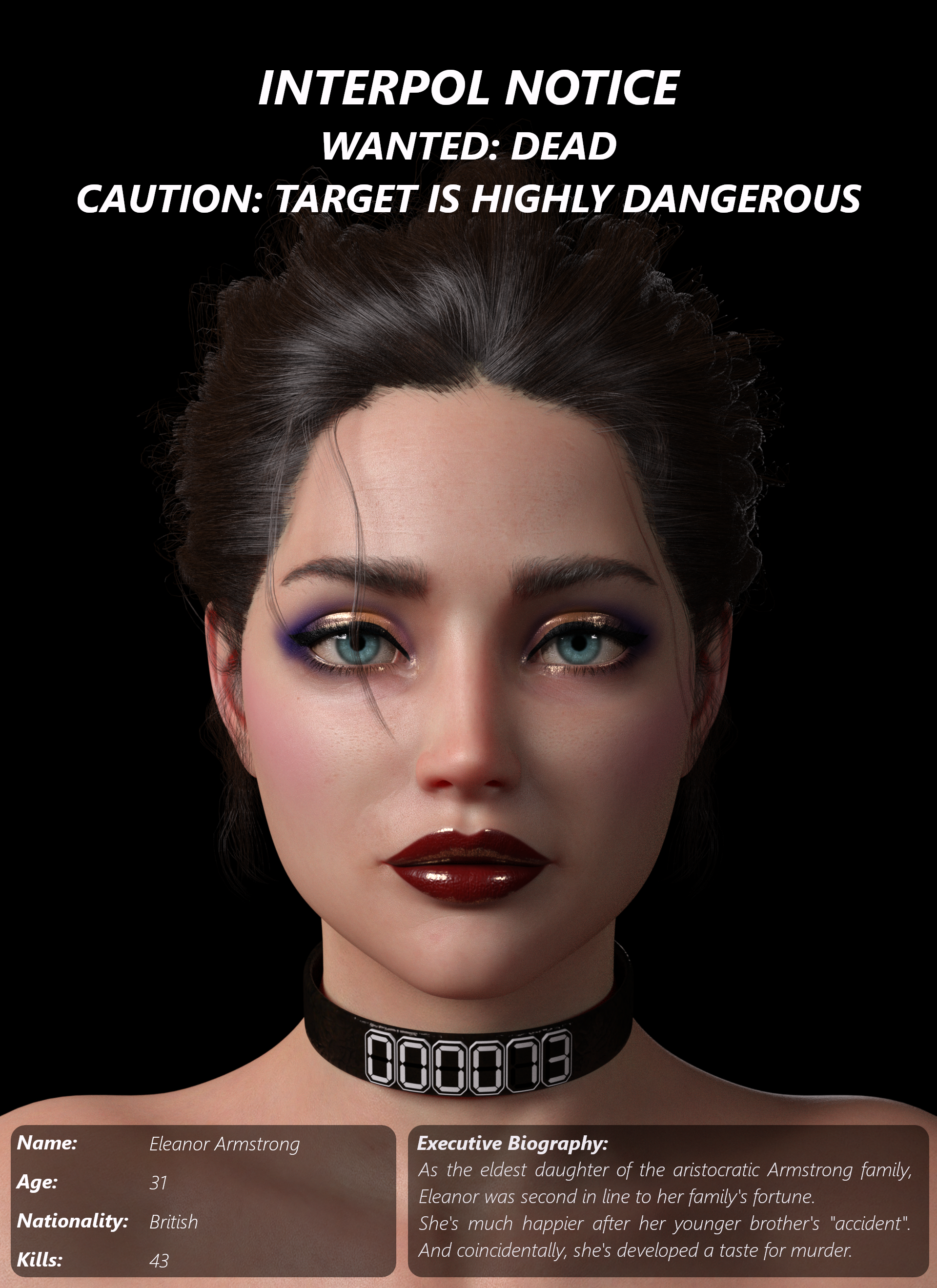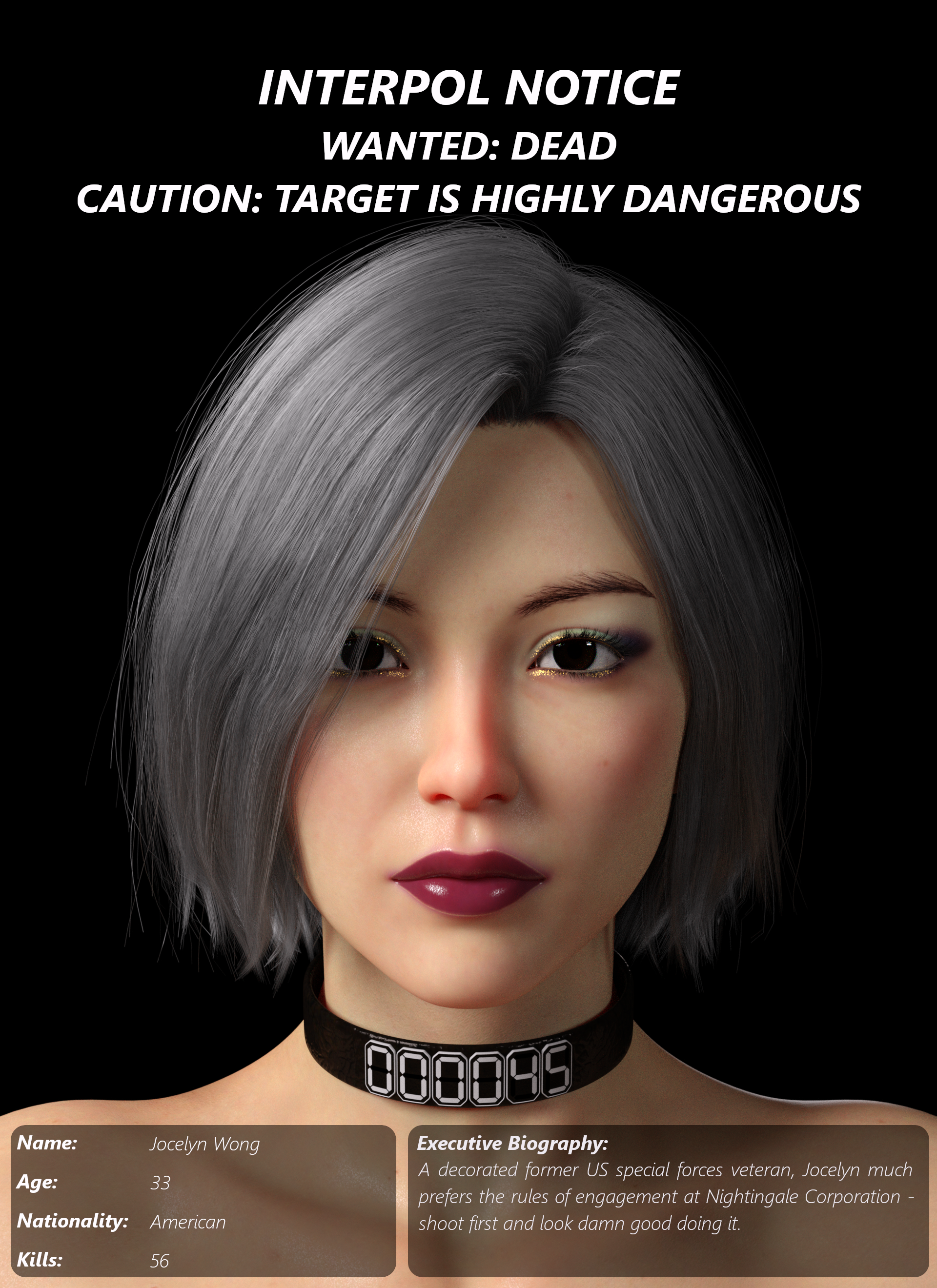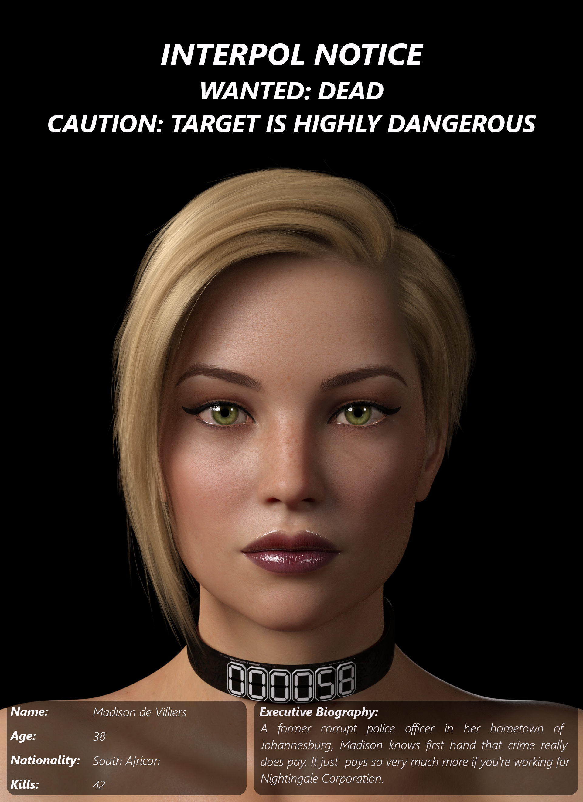 Please see Wanted Notices for three high-ranking Nightingale Operatives. All beautiful. All dangerous. All wanted dead by Interpol (and trust me, the world will be better off without them).