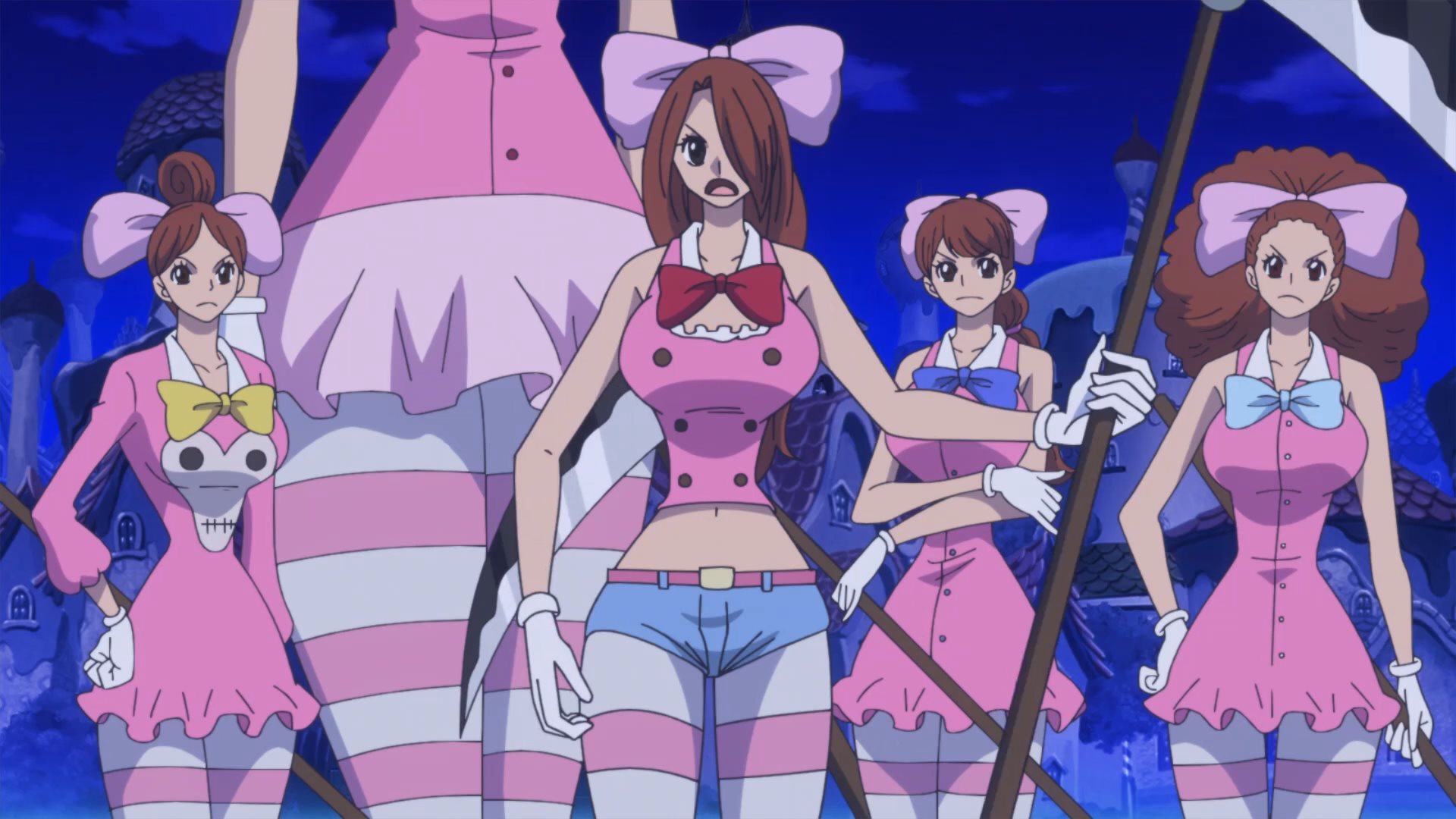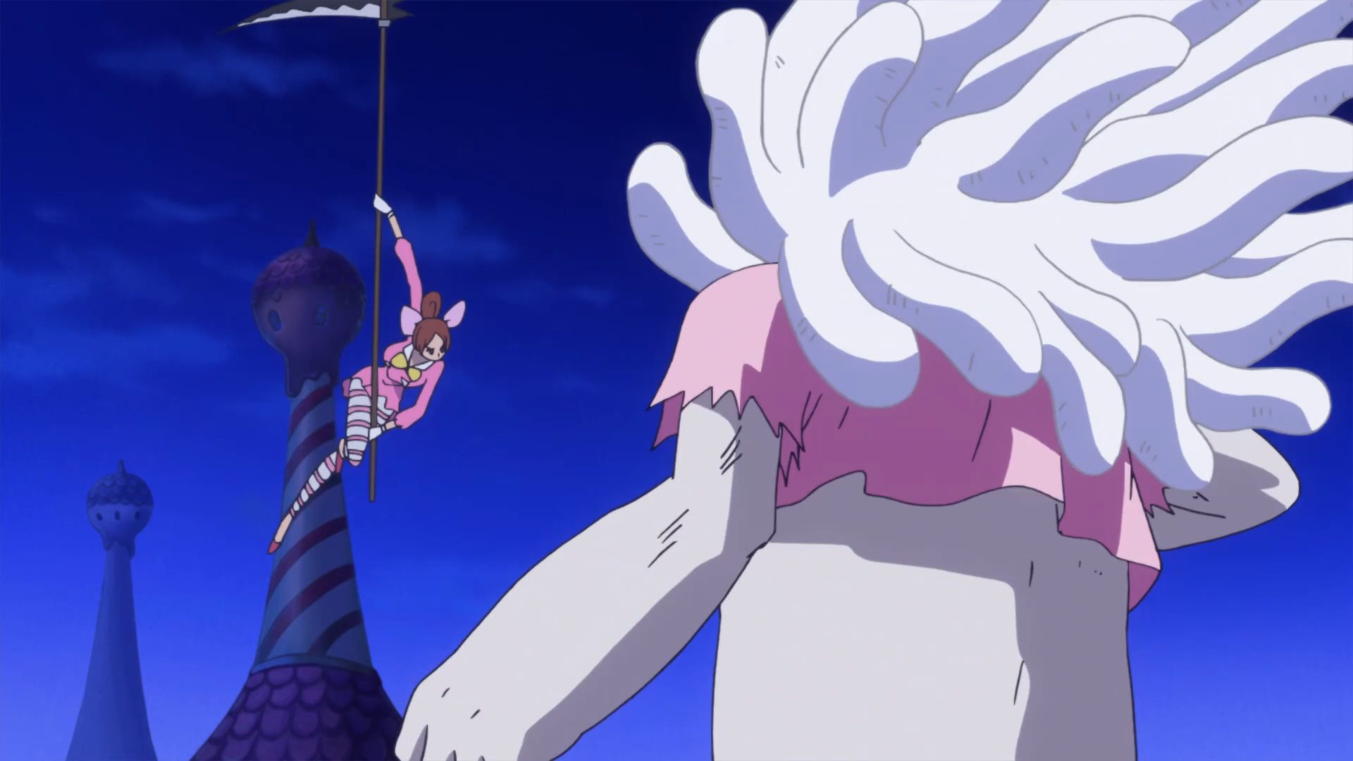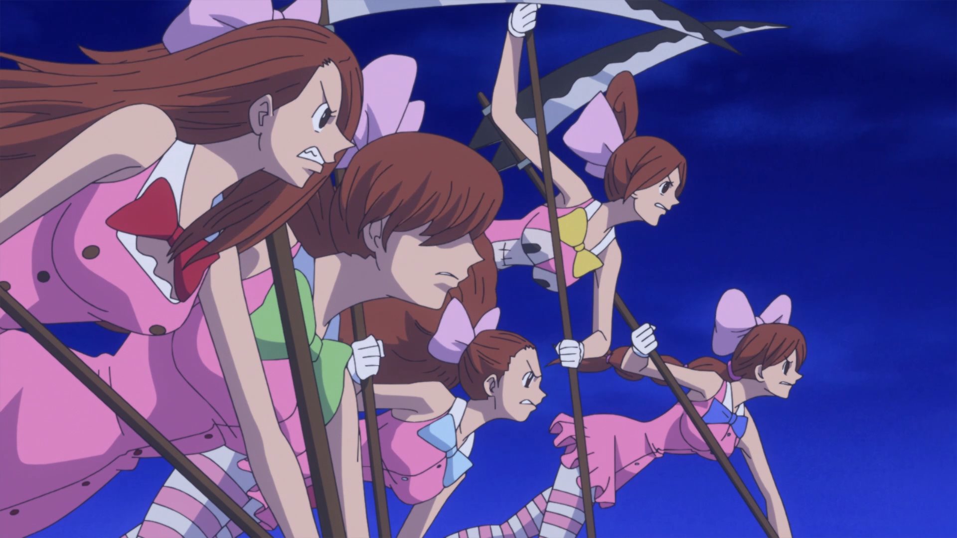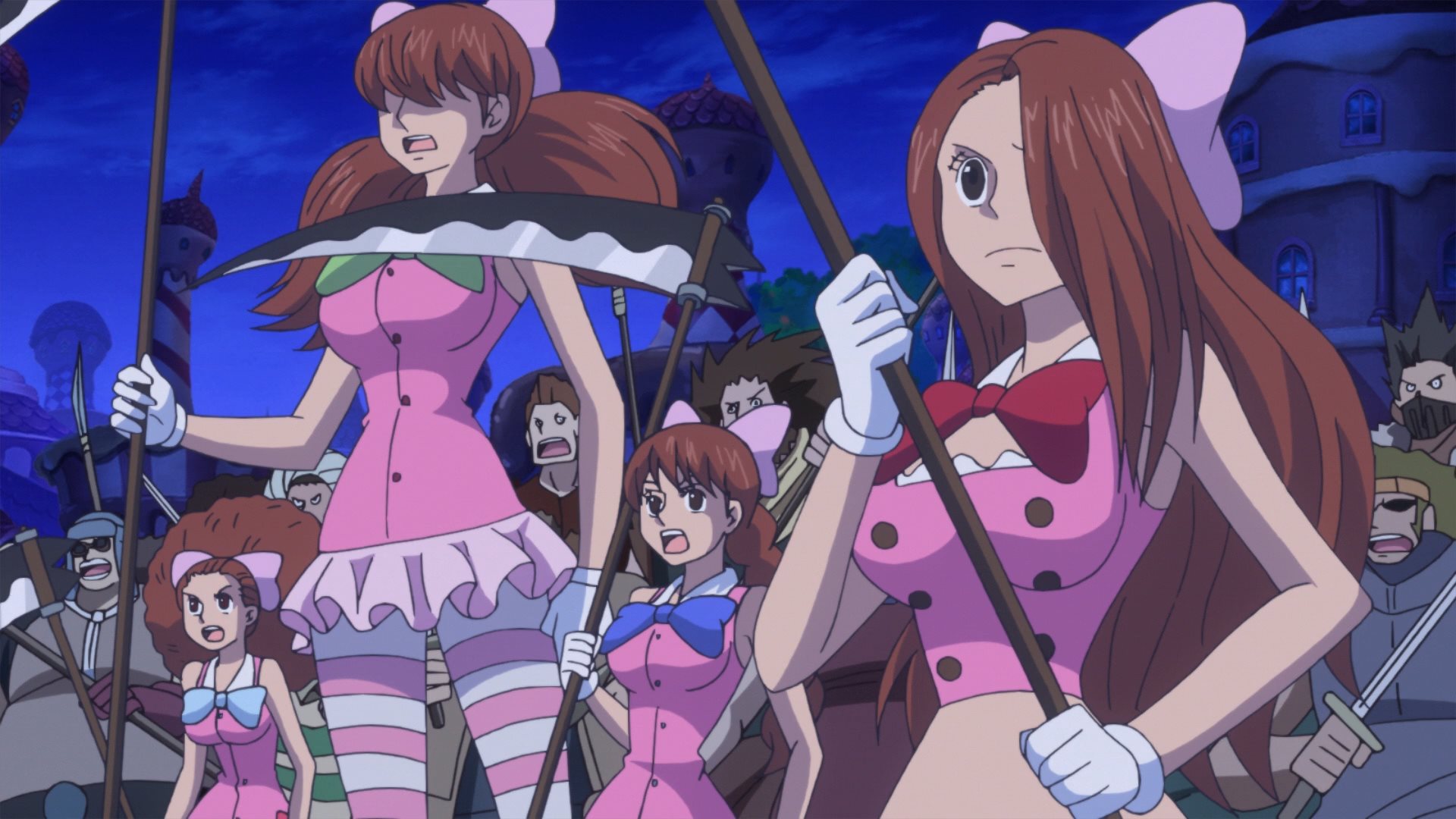 Defeated by a giant poodle... how humiliating. :DLatest One Piece episodes (869-872) have 5 zako with scythes Known as the female half of the Charlotte Decuplets: Nutmeg (30), Akimeg (31), Allmeg (32), Harumeg (33), and Fuyumeg (34). Toei's usual crap animation and cell reuse is on full display, but they're still cute. Their orders are to kill any Straw Hat Pirate that emerges from the mirror. Unfortunately, they are no match for a Pekoms during a full moon, who transforms into a powerful Sulong and quickly dispatches them.