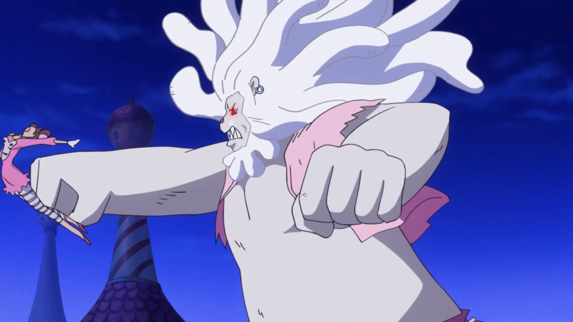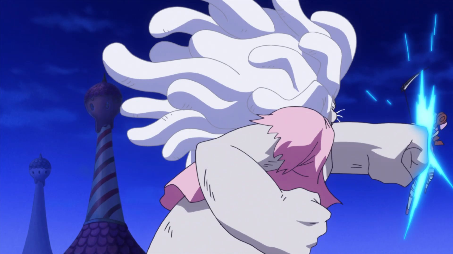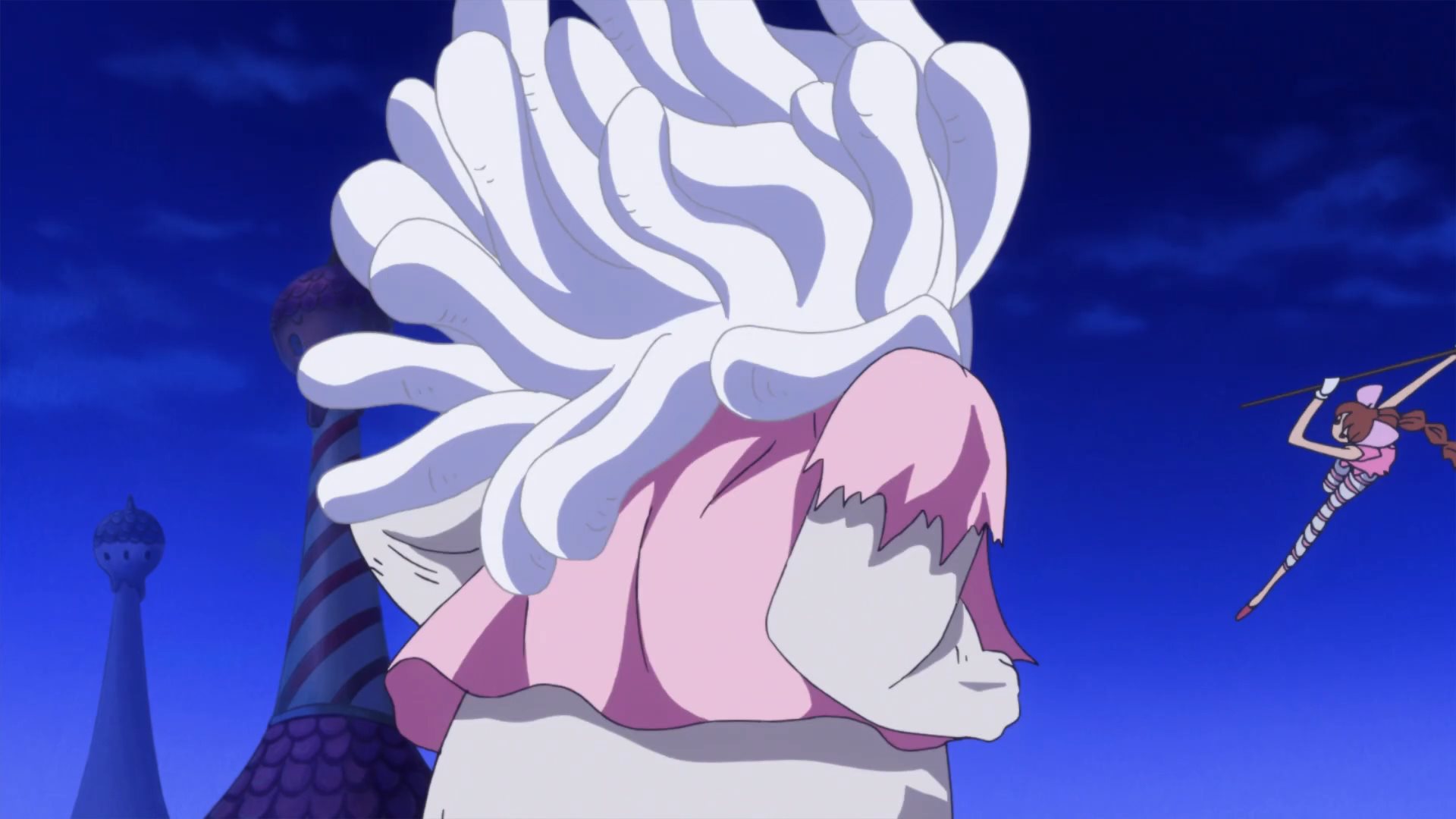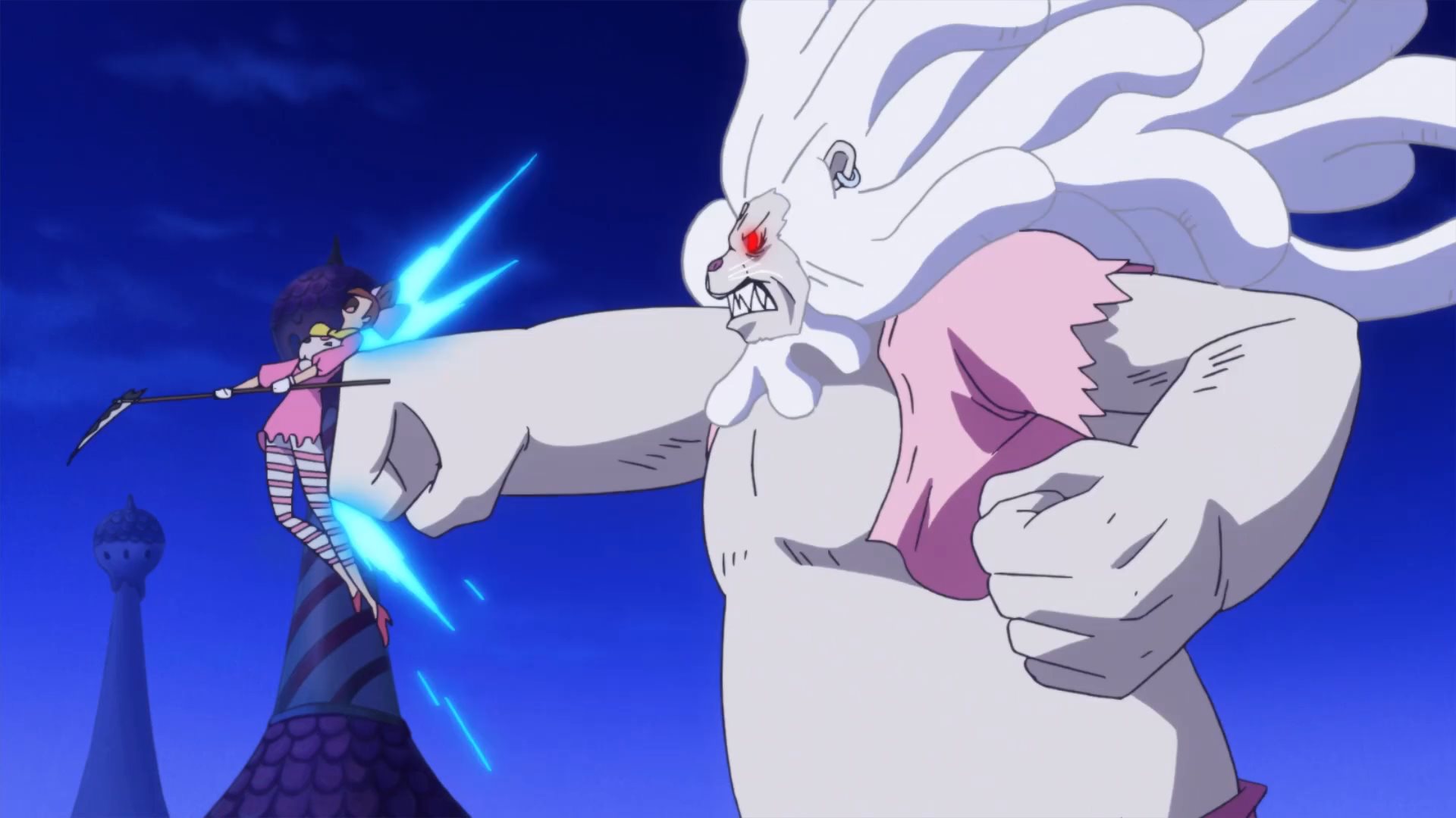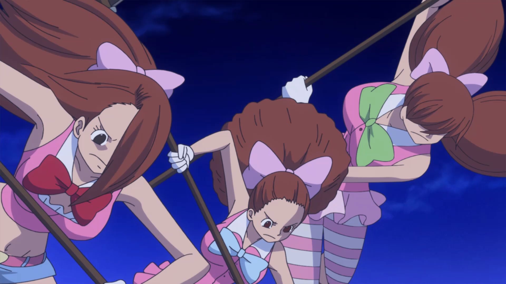 Defeated by a giant poodle... how humiliating. :DLatest One Piece episodes (869-872) have 5 zako with scythes Known as the female half of the Charlotte Decuplets: Nutmeg (30), Akimeg (31), Allmeg (32), Harumeg (33), and Fuyumeg (34). Toei's usual crap animation and cell reuse is on full display, but they're still cute. Their orders are to kill any Straw Hat Pirate that emerges from the mirror. Unfortunately, they are no match for a Pekoms during a full moon, who transforms into a powerful Sulong and quickly dispatches them.