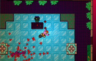 Jacket came to the mafia boss for all his revenge. He lost his life with his girlfriend. He killed a pawn and a fat man and looked at the nice sports car that Boss had and thought how many people died to get it. Once again, he went up the stairs angrily. After climbing the stairs and killing the dogs, Jacket encountered the boss's female bodyguard.