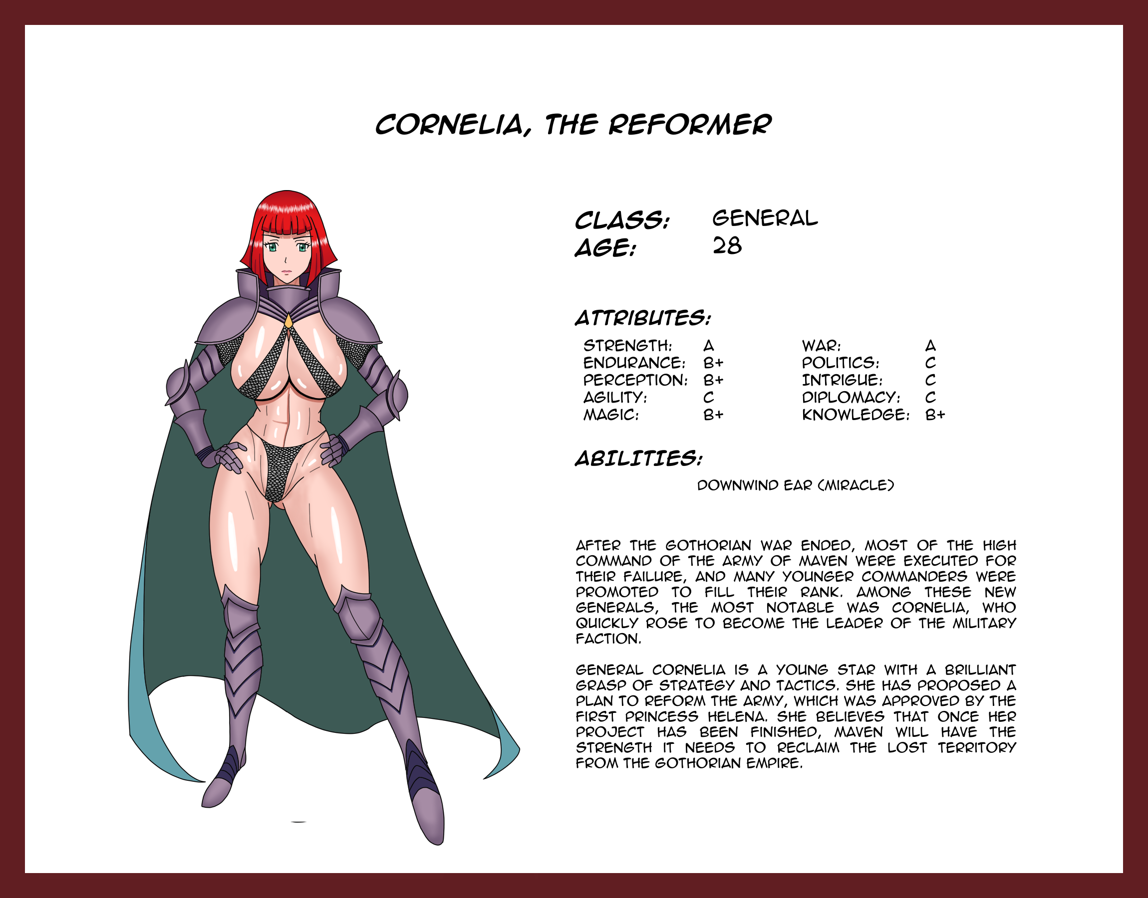 Cornelia is one of the young commanders of the Army of Maven that were promoted to General after the Gothorian War, who quickly rose to become the leader of the military faction in the court.