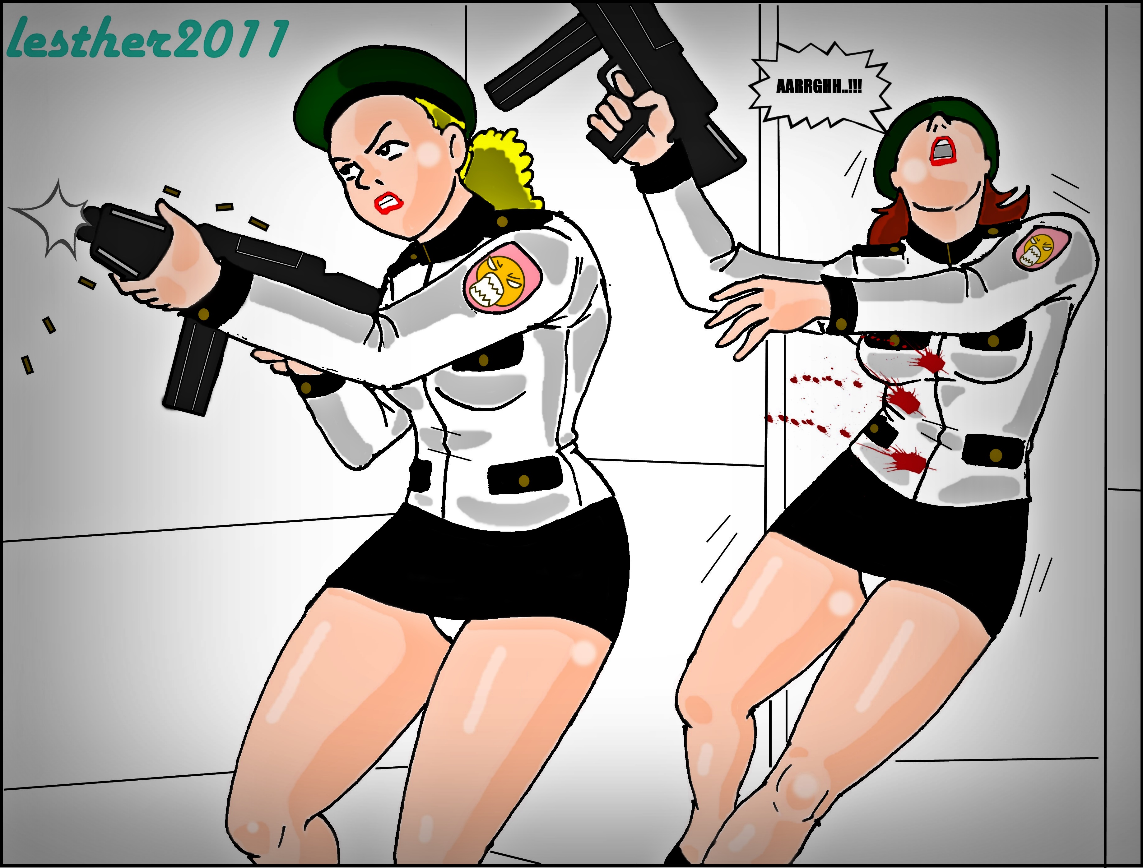 So good art. Upskirt is always an eye candy. White shirts and black mini-skirts too. Blood on the white looks perfect. Interesting, their panties are the parts of the uniform or both of them choose white this day? Good to see she's dying with a sound, good to see red lipstick on their lips. Good light effect on their thighs.
