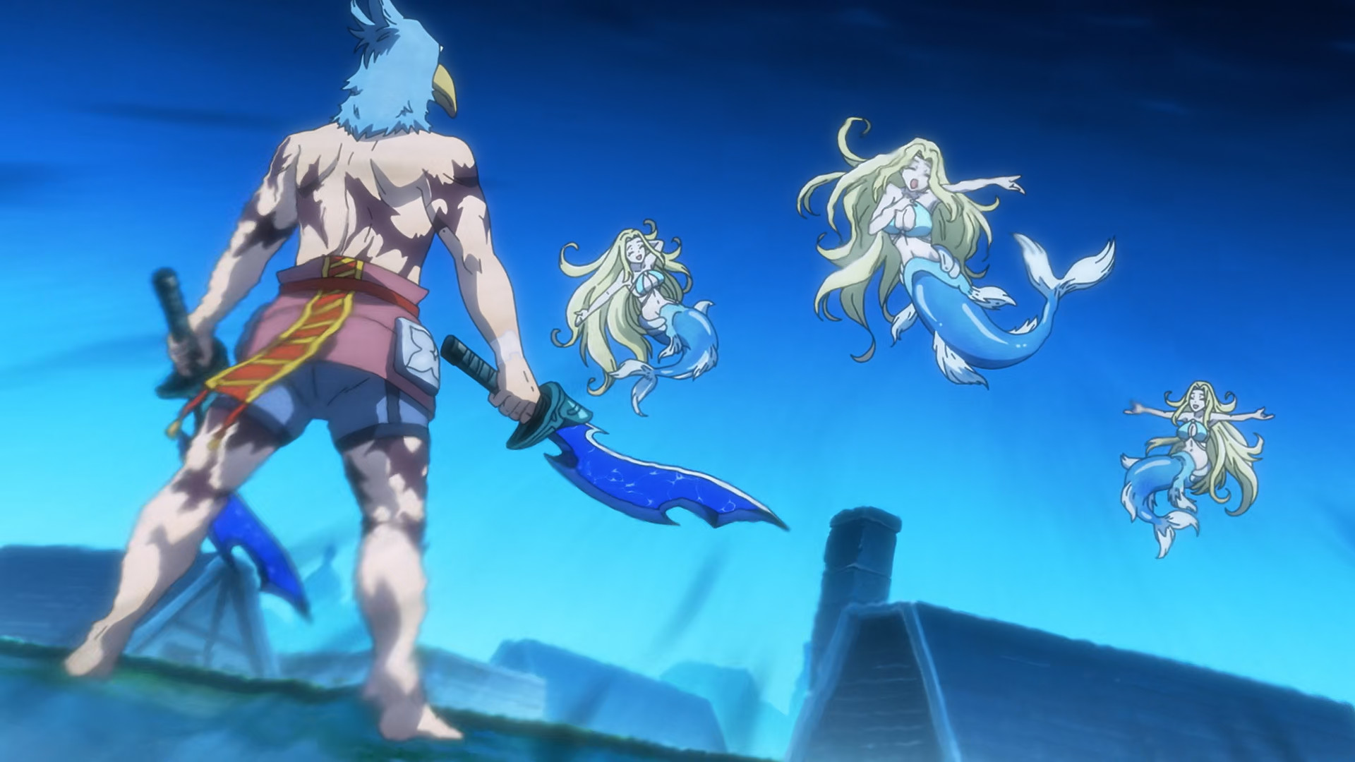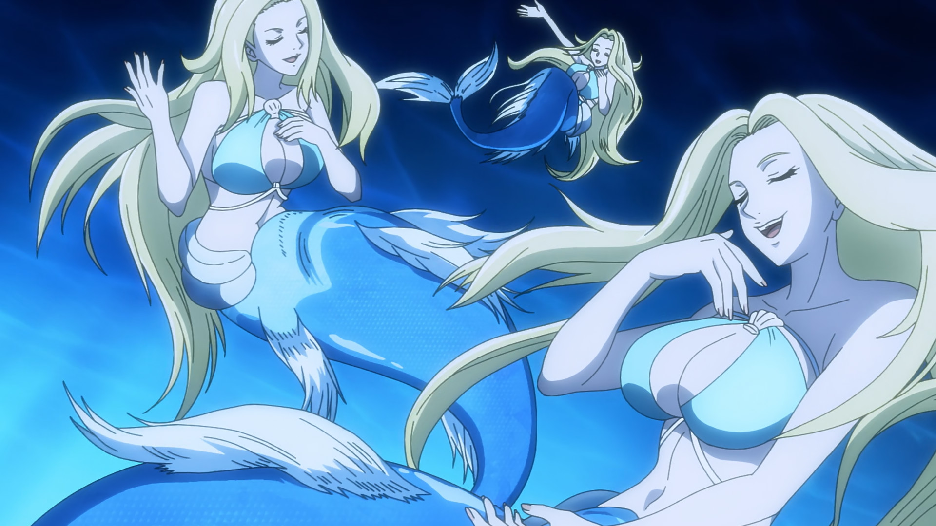 Mermaids are usually good in RPGs. Why did they attack him? Or this is one of those dumb "the world is just an MMO" anime where they ruin the fantasy by making it into a video game and NPCs are just 1 dimensional?Shangri-La Frontier episode 44. Mermesis Bagroon (マーメシス・バグルーン) are encountered in a VR MMO called "Shangri-La Frontier." Mermesis attack with their song, which seems to have no effect on Sunraku, but is hurting Araba, an NPC he just met. Sunraku engages them, but takes damage and realizes healing potions no longer work on him. Then, Araba takes advantage of them being distracted to attack one from behind, defeating it. The remaining two Mermesis are allowed to retreat.