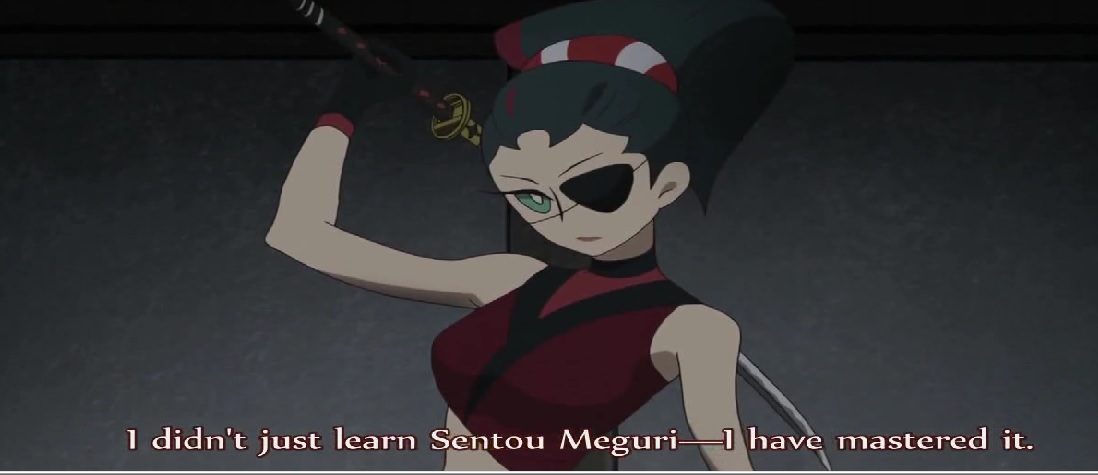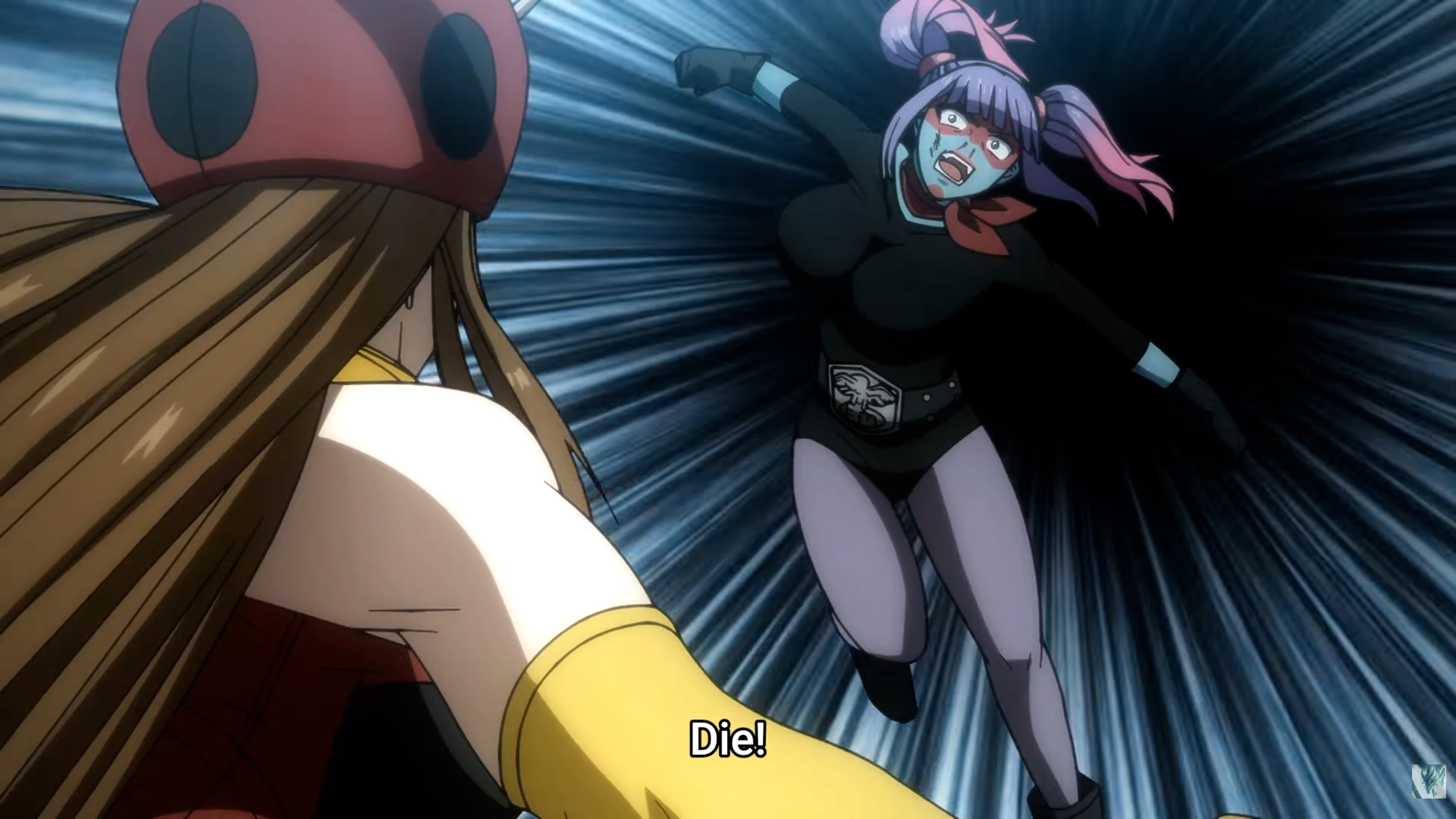 The "hero" sure is an annoying Mary Sue like most anime protagonists. Not sure why japanese enjoy these overpowered heroes who always win, I find that just terribly boring. She keeps smiling like she was gassed by Joker gas throughout the whole thing.