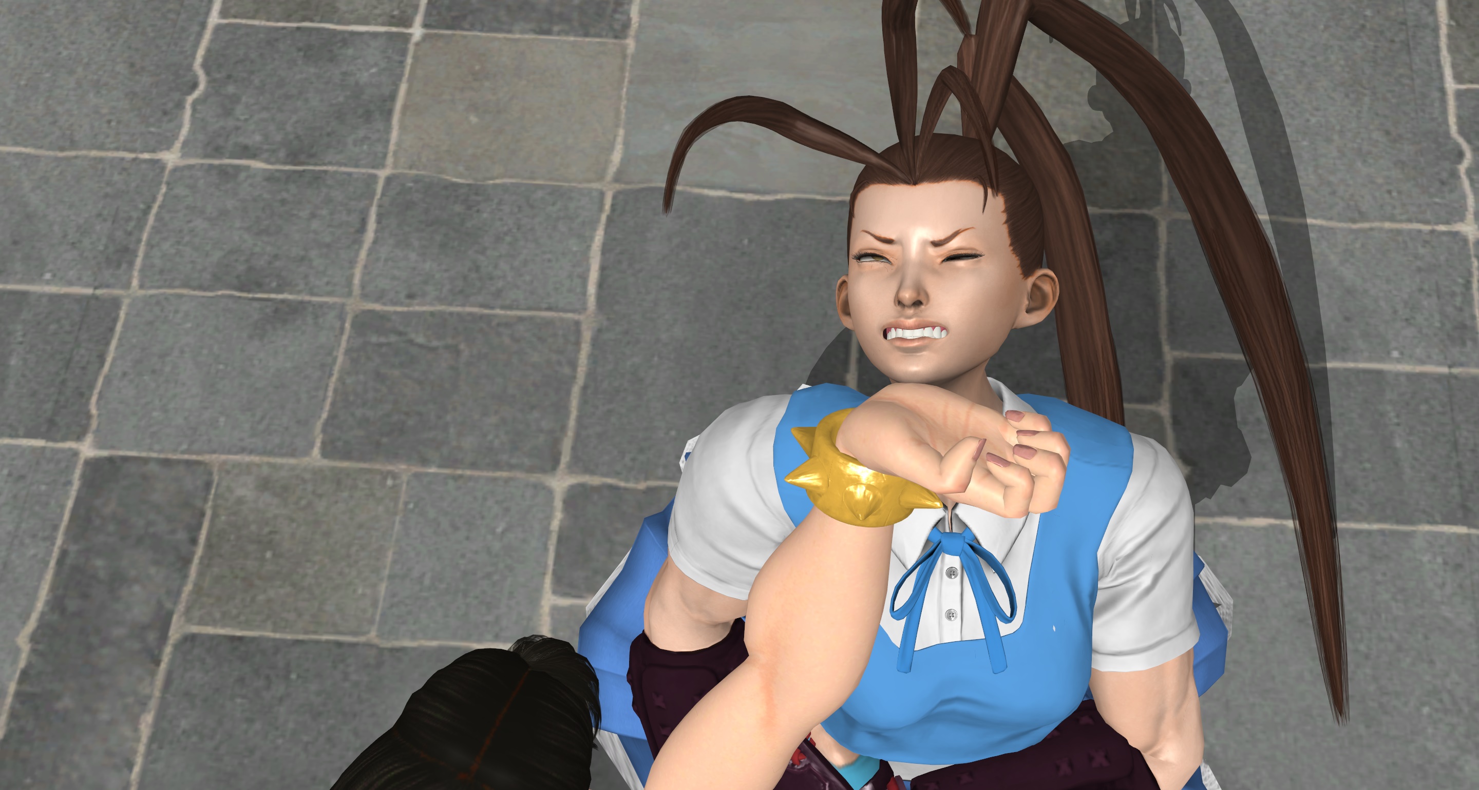 Her other friends take the opportunity to take down the guards. The neck snap move would be familiar to people who have played Tenchu, albeit this one doesn't go all the way to twist the head 180 degrees. Which is pretty insane.