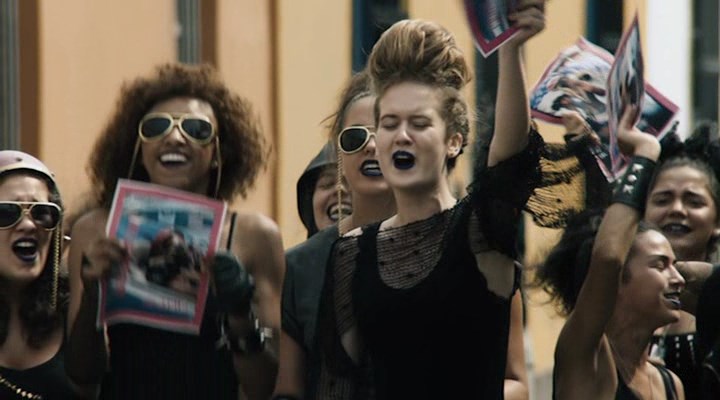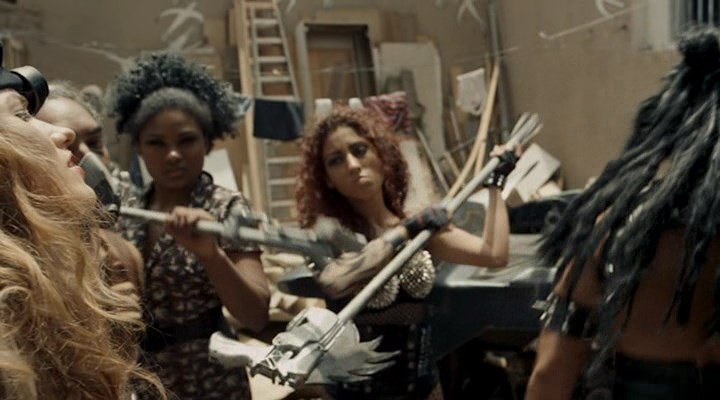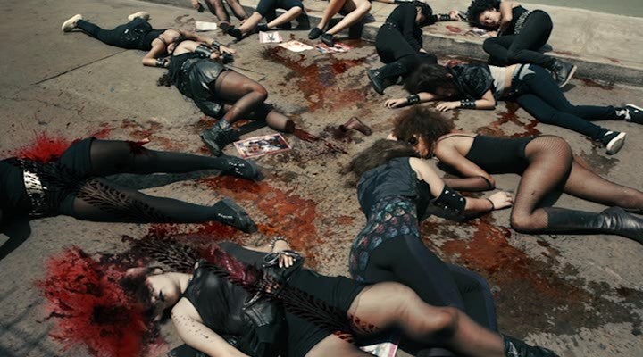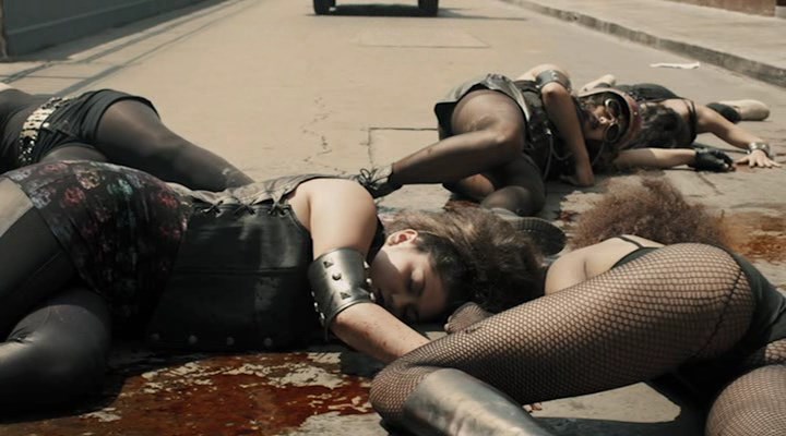 Another scene features one of the racers, a crazy evangelist terrorist girl, running over the leather-clad fangirls of the black radical rapper racer girls, to score points. Ends with a nice bodypile.