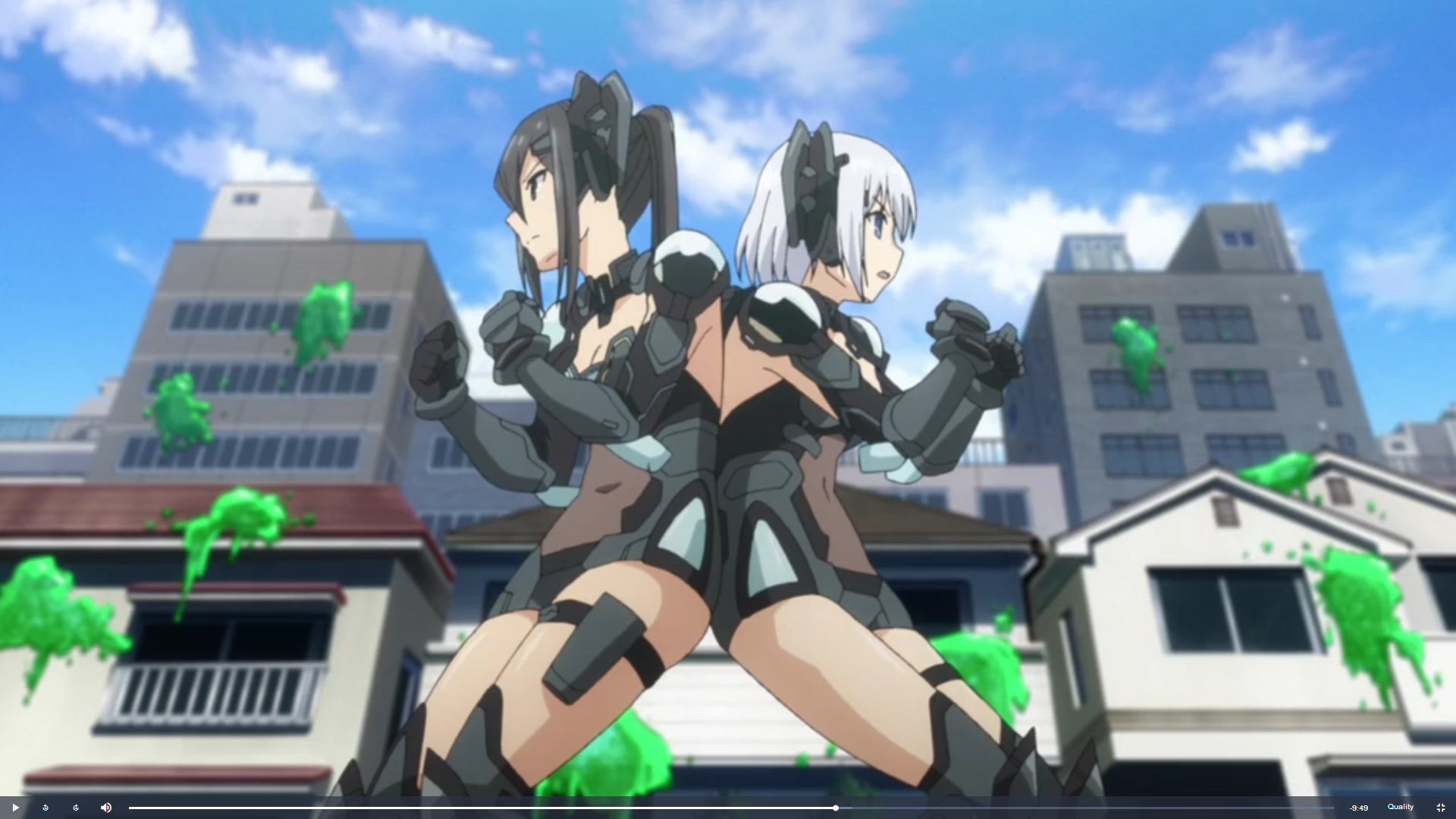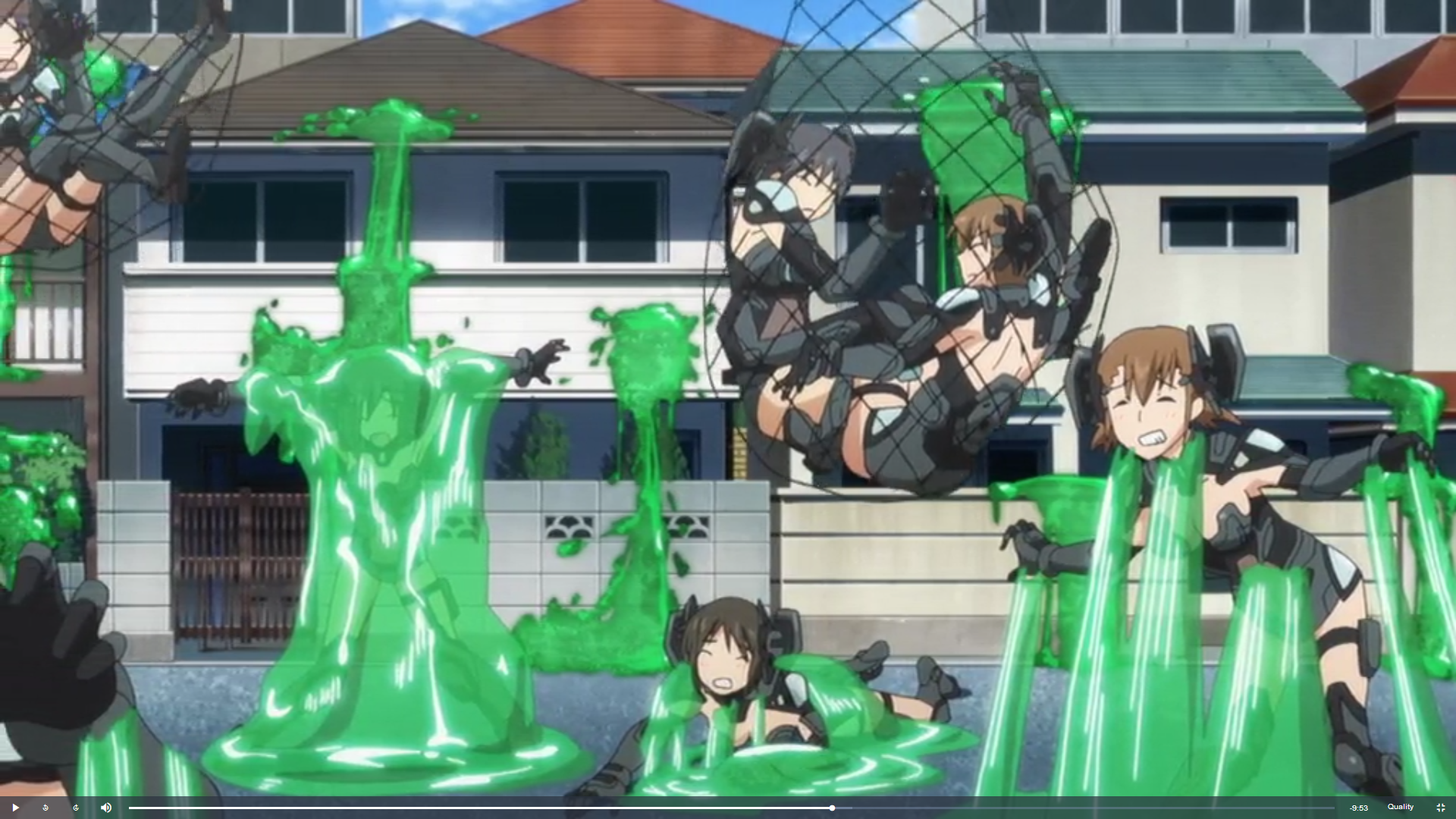 Damn, I knew this, I even took screenshots... but I cannot remember now. I know the girls were some sort of a police force trying to stop the heroes and they are shot down with stun jelly or whatever that makes them all fall down in a bodypile in the alley.Sorry, I know this is a necropost, but I just found these lovely pictures and want to know what anime they come from. If KeiBreilSL isn't around anymore, can someone else kindly illuminate?