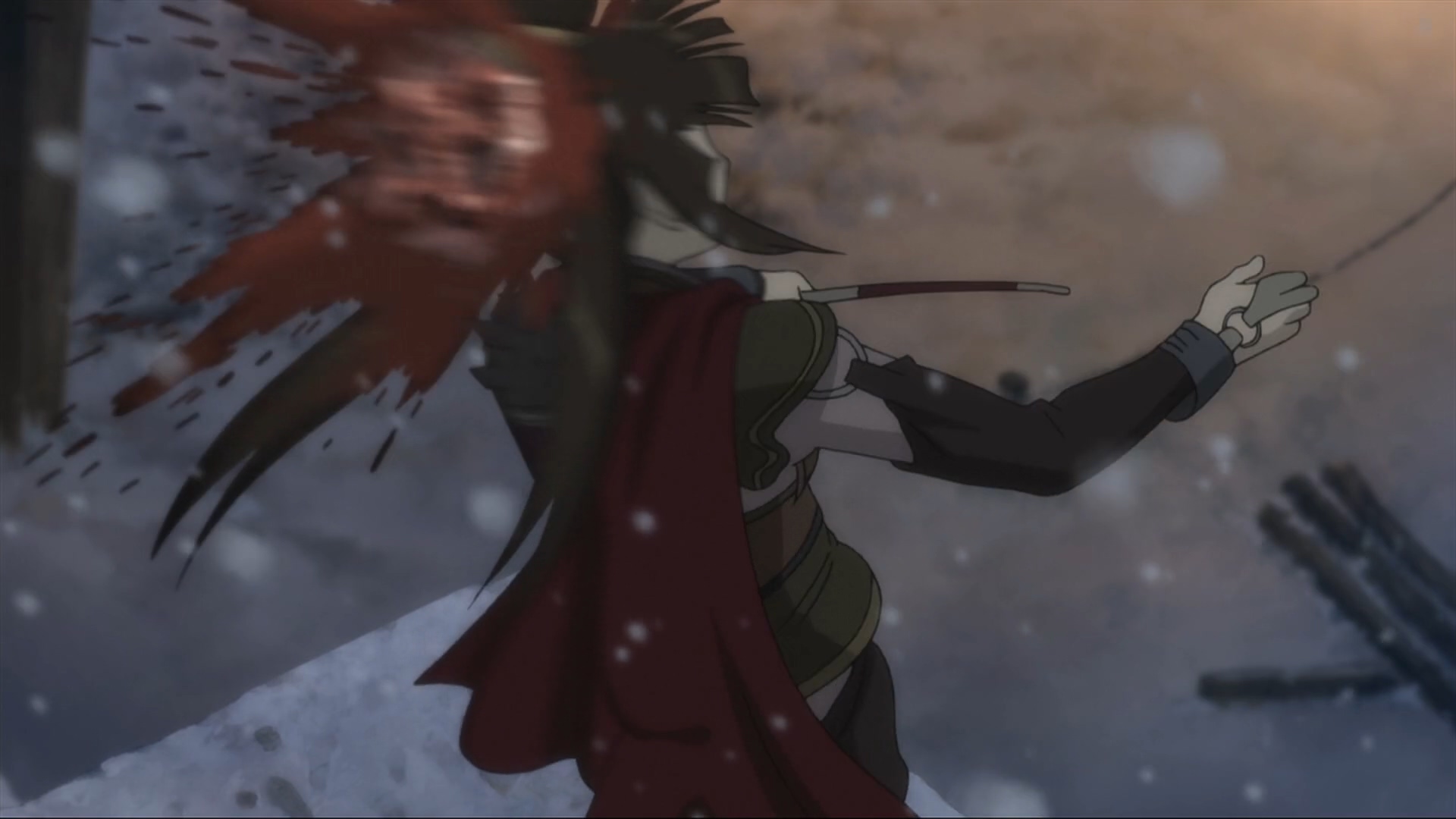 Wow, the second gal is grinning like she is the Joker. Also she refuses to die from even that? They had quite the balls to attack that many soldiers... Btw what happened to the archer? They just aim at each other and then her head explodes like on Scanners? :D That seems more likely if the guy had a shotgun, not a bow.
