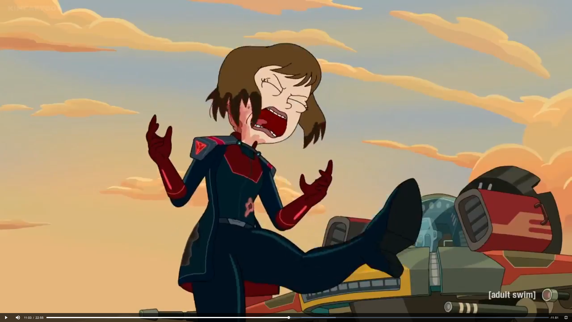 From the season ending episode of Rick and Morty, the villainess Tammy (who betrayed Rick and Birdperson 2 seasons ago and joined the new Federation) gets her comeuppance. She appears to hunt down a clone of Beth and attacks the real Beth at her therapist, roughing her up for fun after capturing her. Rick uses her ship to gun down her alien troops, and then activates a flamethrower hidden in the ceiling, which sets her coat on fire - as she panics she drops her weapon and Rick shoots her in the back, Tammy falling on her face on a table, still burning.