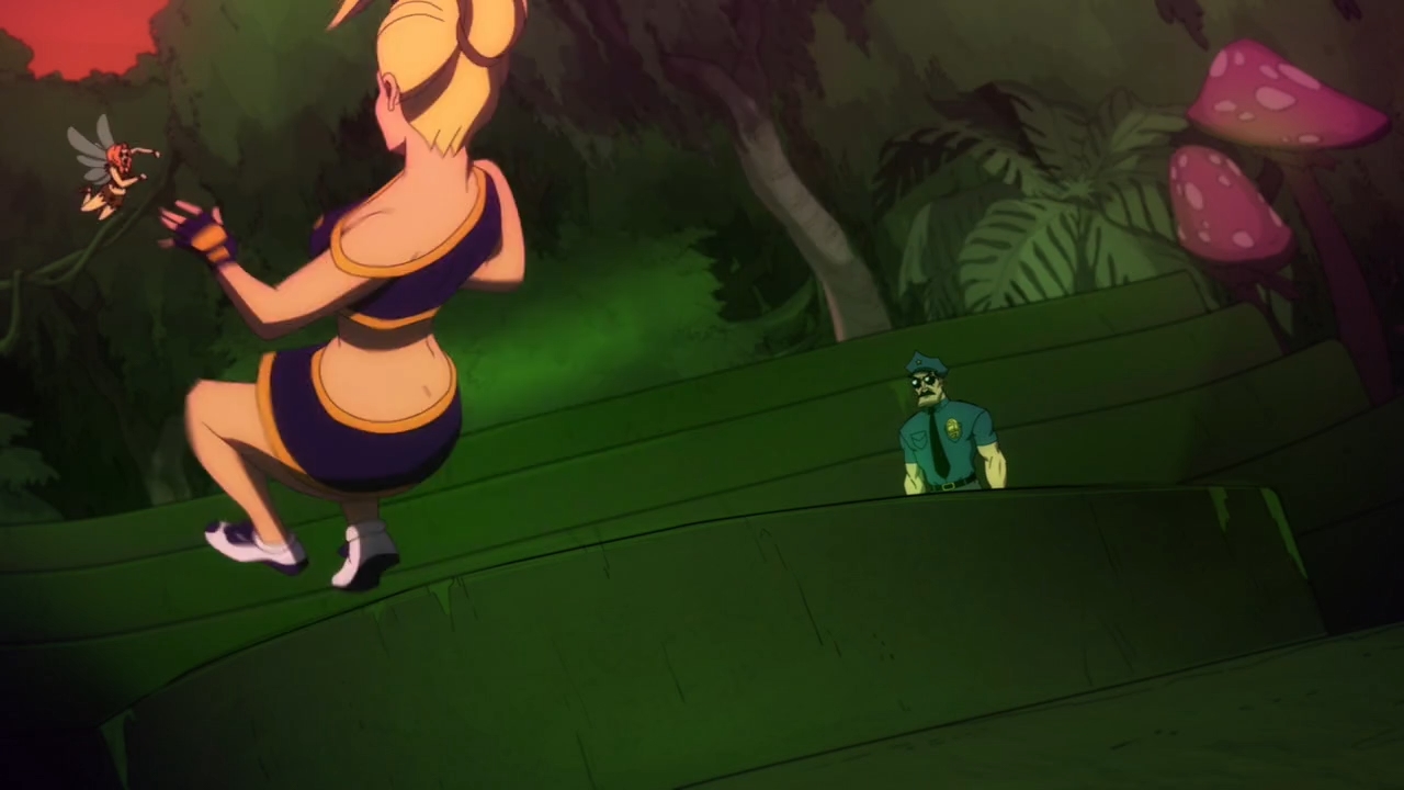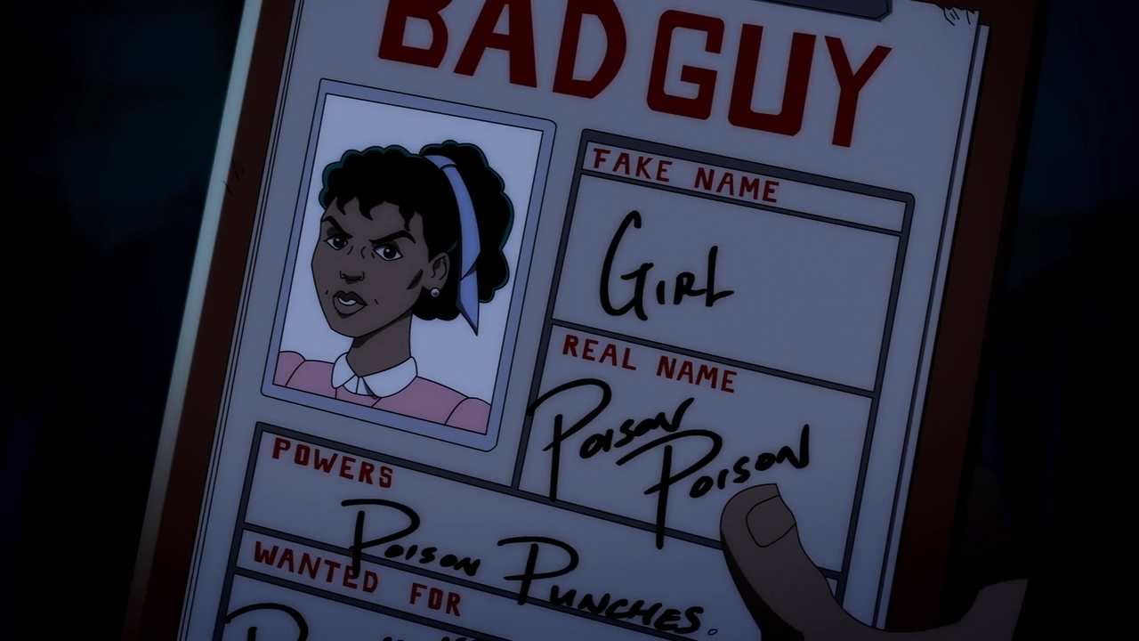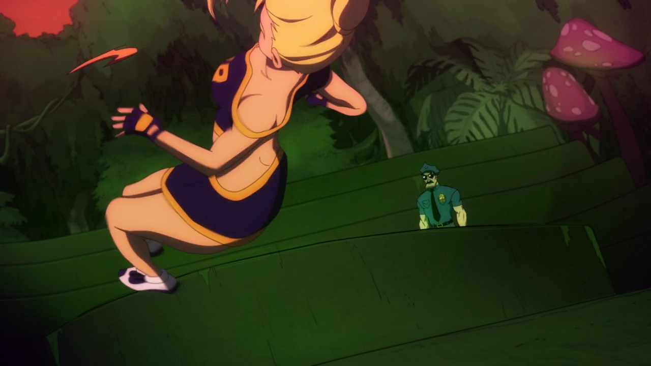 A young couple is getting romantic in a car when Axe Cop shows out of nowhere and beheads the black girl, to her partner's shock. He then explains to him she was a villainess called Poison Poison who uses poison punches to kill people... while all the while her headless corpse keeps pushing the car horn with her boobs.