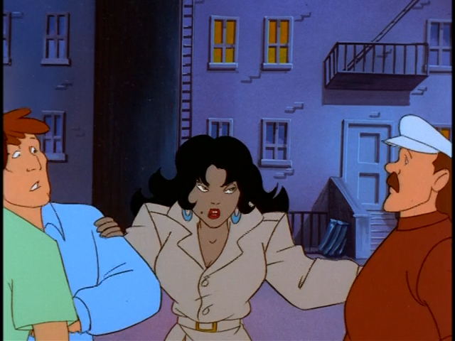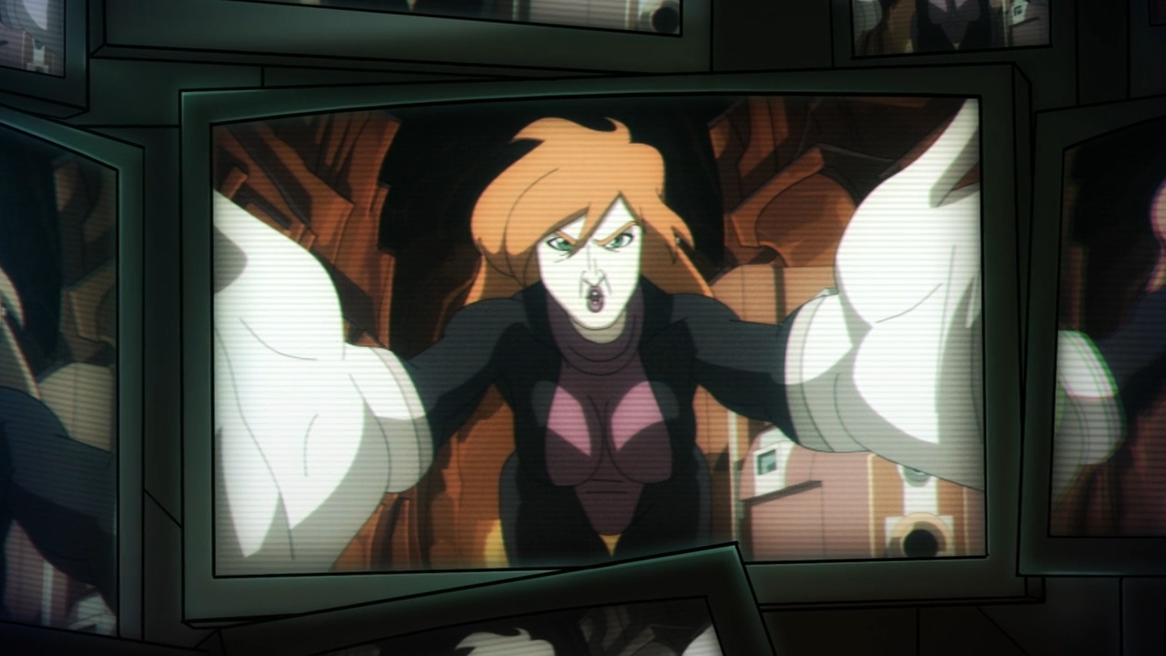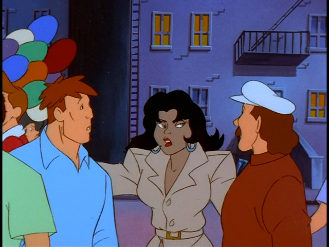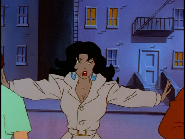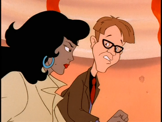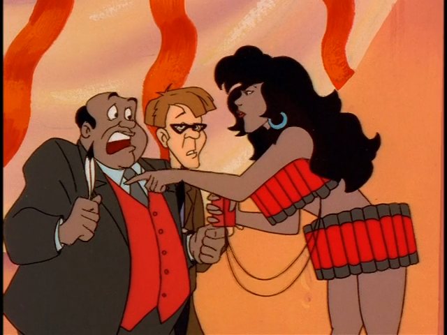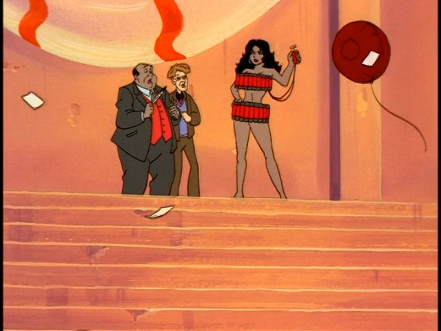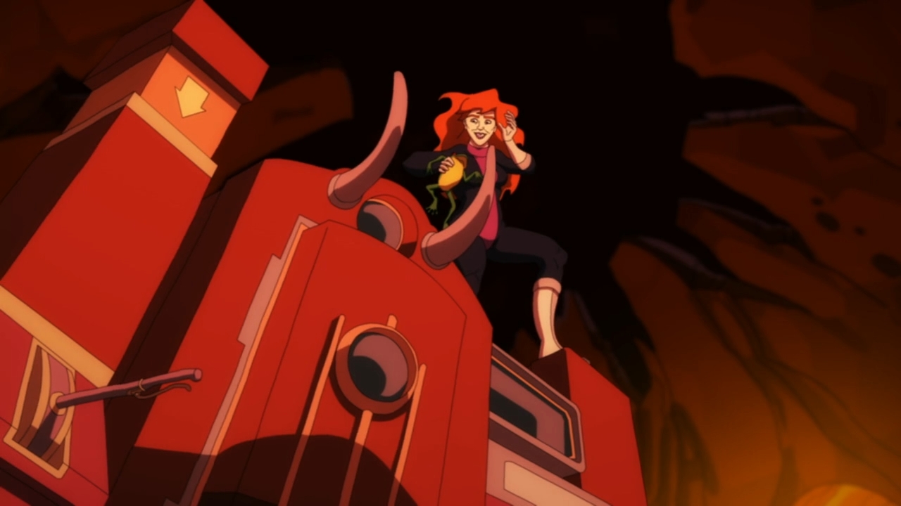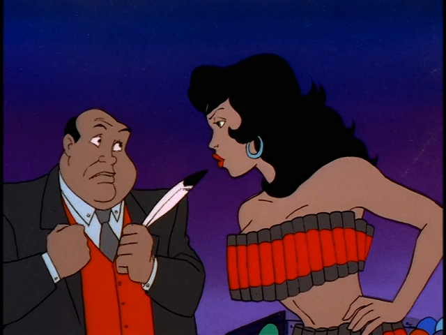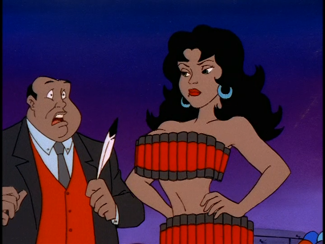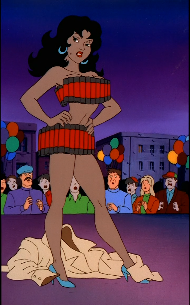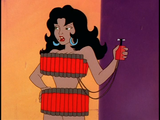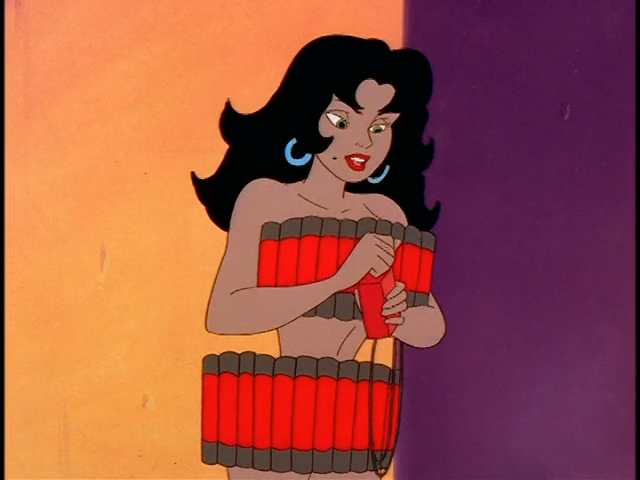 The Evil Red-Headed Woman - yes, that is really her name. She sure is crazy-looking but very voluptuous. After Axe Cops kills her children (since they were evil and that's how nuanced Axe Cop's morals are... reminds me of a certain elderly Jedi master, hmmm) she plans to travel back in time and turn all animals evil so all humans will become evil too. She actually succeeds, and sics the evil animals on Axe Cop and Super Axe, though they behead them all. She then attacks them riding a gorilla riding a lion riding an elephant - to stop such a potent combo the heroes combine their axes to a diamond axe that slices her and the animals into vertical slices.
