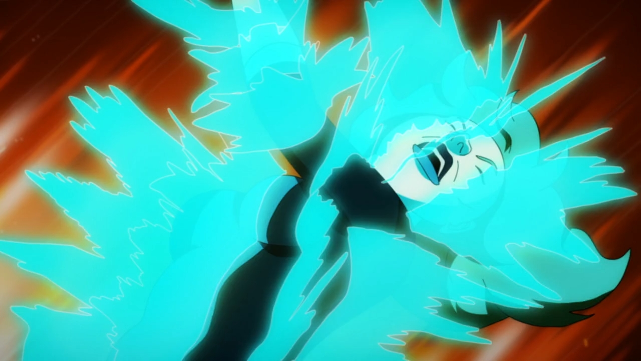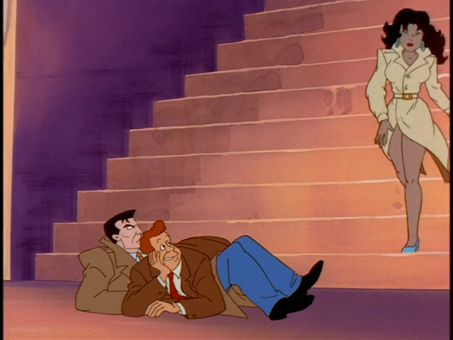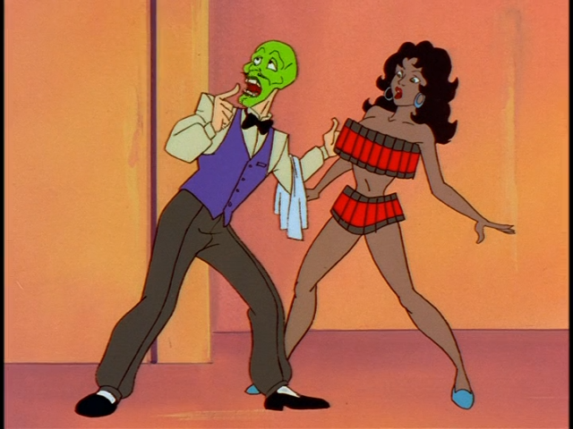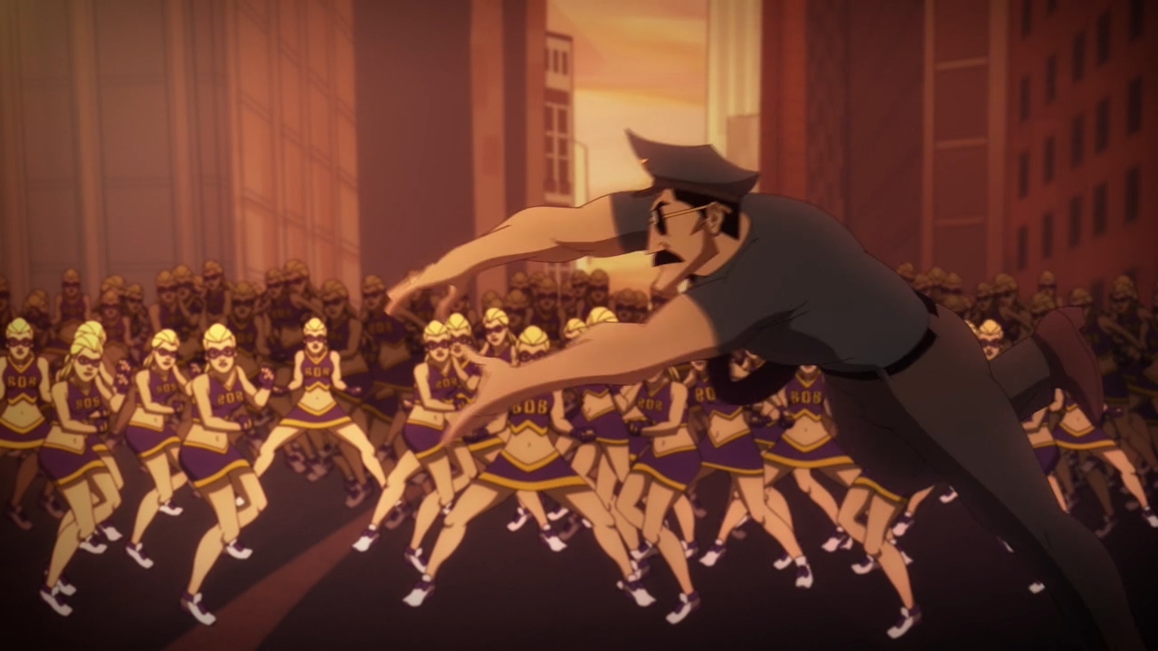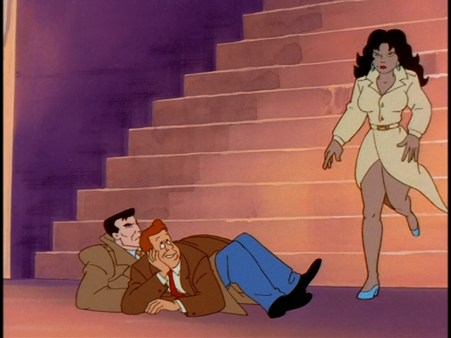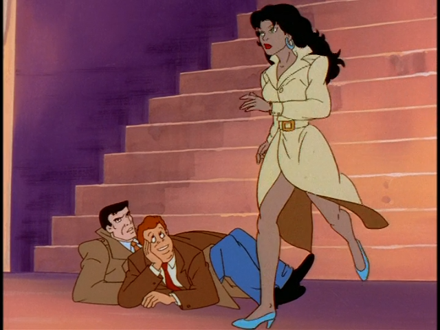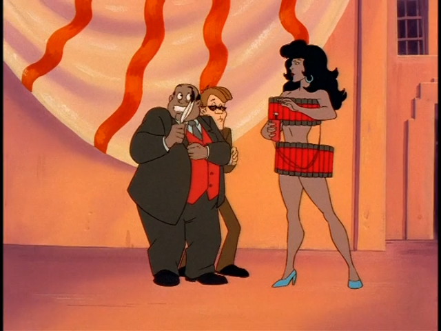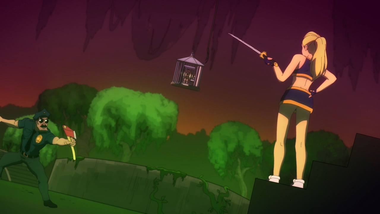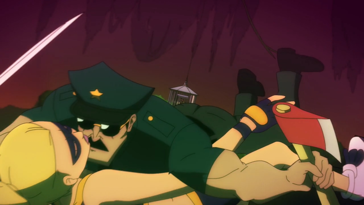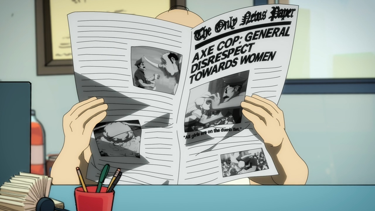 Axe Cop fights some badguys on a pier and uses an energy drink to become super fast and turn his axe invisible as he dashes through them, chopping off all their heads. You can see a nice Catwoman-like villainess on the right in fishnet stockings and horned mask before her head falls off and she topples over.