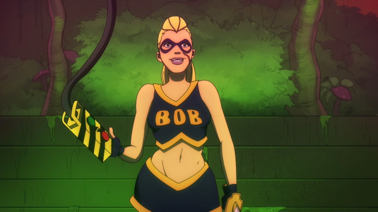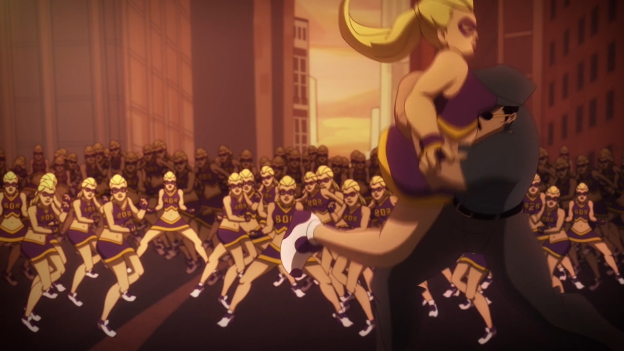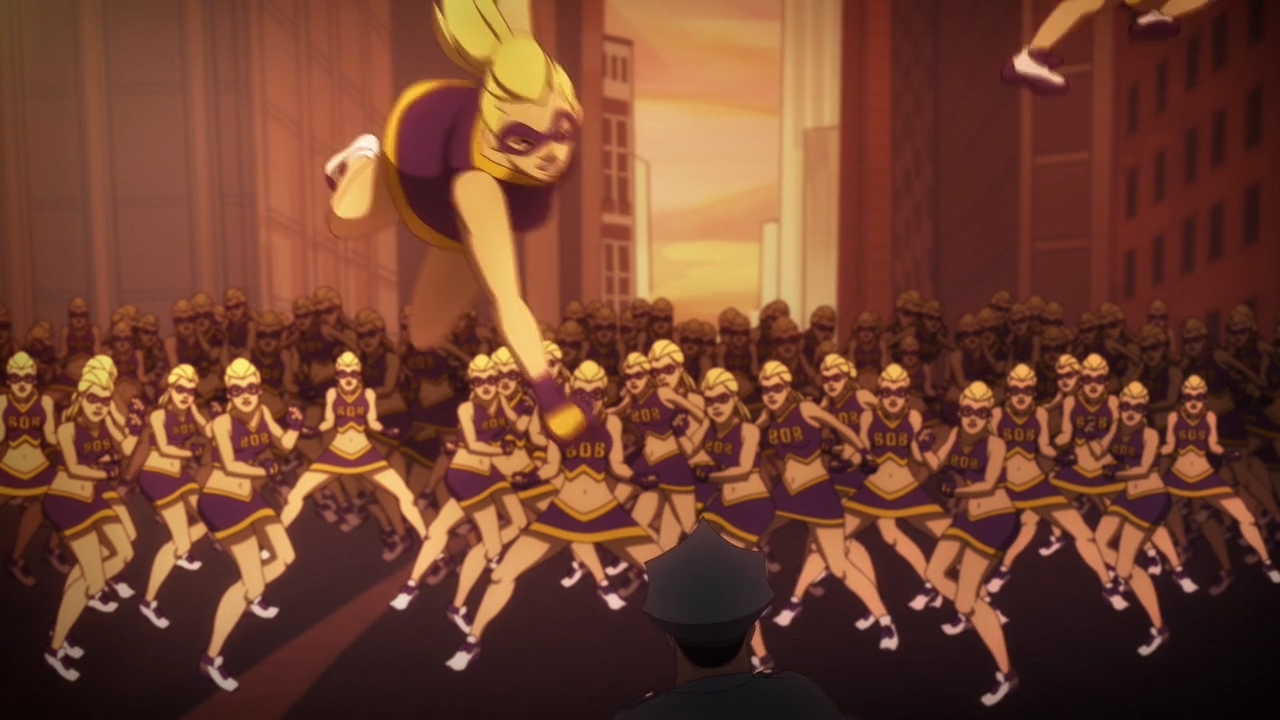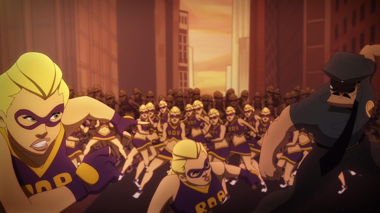 Given his macho violent ways it should come as no surprise that Axe Cop is also a raging misogynist, believing "girls are dumb" and refusing to have them on his team. A chance meeting with BOB and her many, MANY twins (or sisters, or clones, who knows?) They are cheerleader-uniformed sexy blondes in purple sports bras and miniskirts (you can see the panties are purple too in some shots) and white sports shoes, wearing domino masks. BOB stands for Beautiful Girly Bob which their unimaginative parents named ALL of them as. When Axe Cop calls them dumb and says he will not let them join, they all attack him, and he punches or tackles them all, and uses one of them as a thrown weapon to knock out the legion of BOBs like bowling pins in an epic scene where they all end up lying around in nice Delmo style poses, legs up.