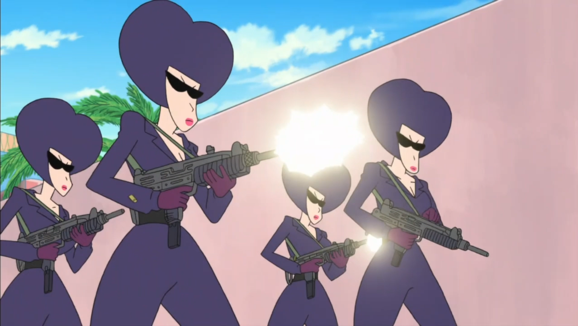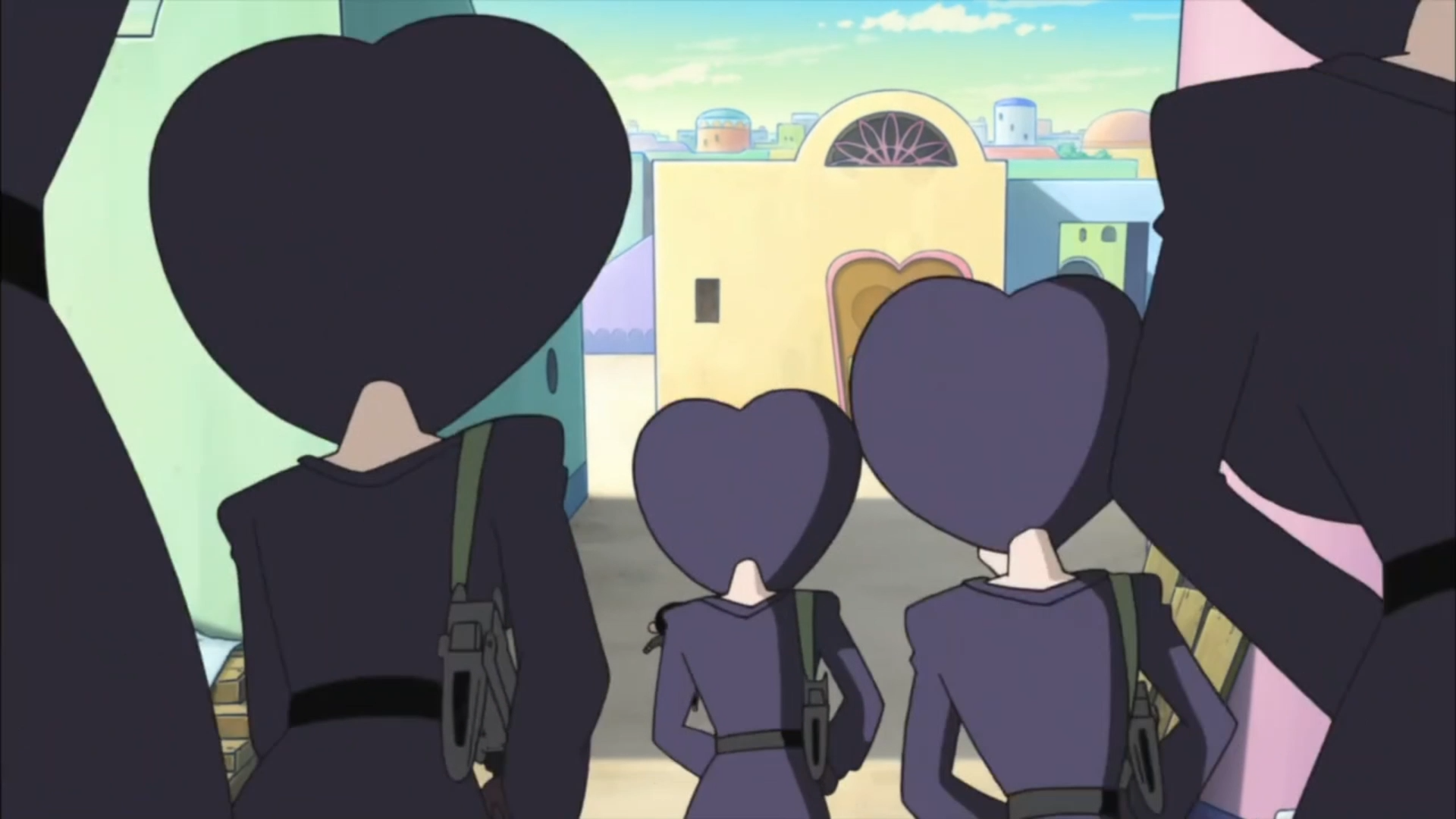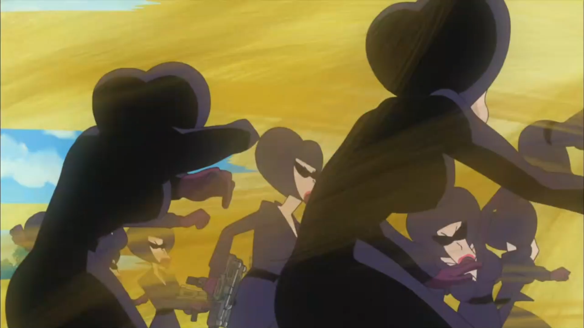 I think I never saw them posted here before, so from the 19th Crayon Shin Chan film (Crayon Shin-Chan: Fierceness That Invites Storm! Operation Golden Spy) Two vilain want to destroy the world and are accompanied by zako with a rather silly design but I love it...They are defeated by a giant...fart...still love them ha ha
