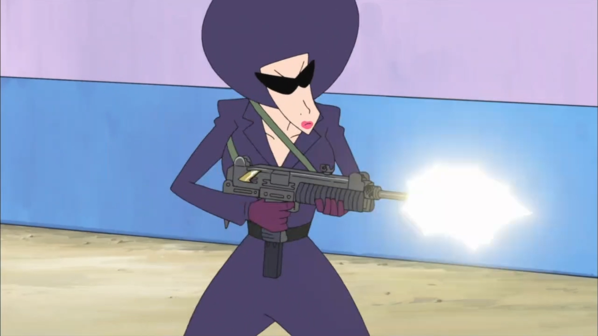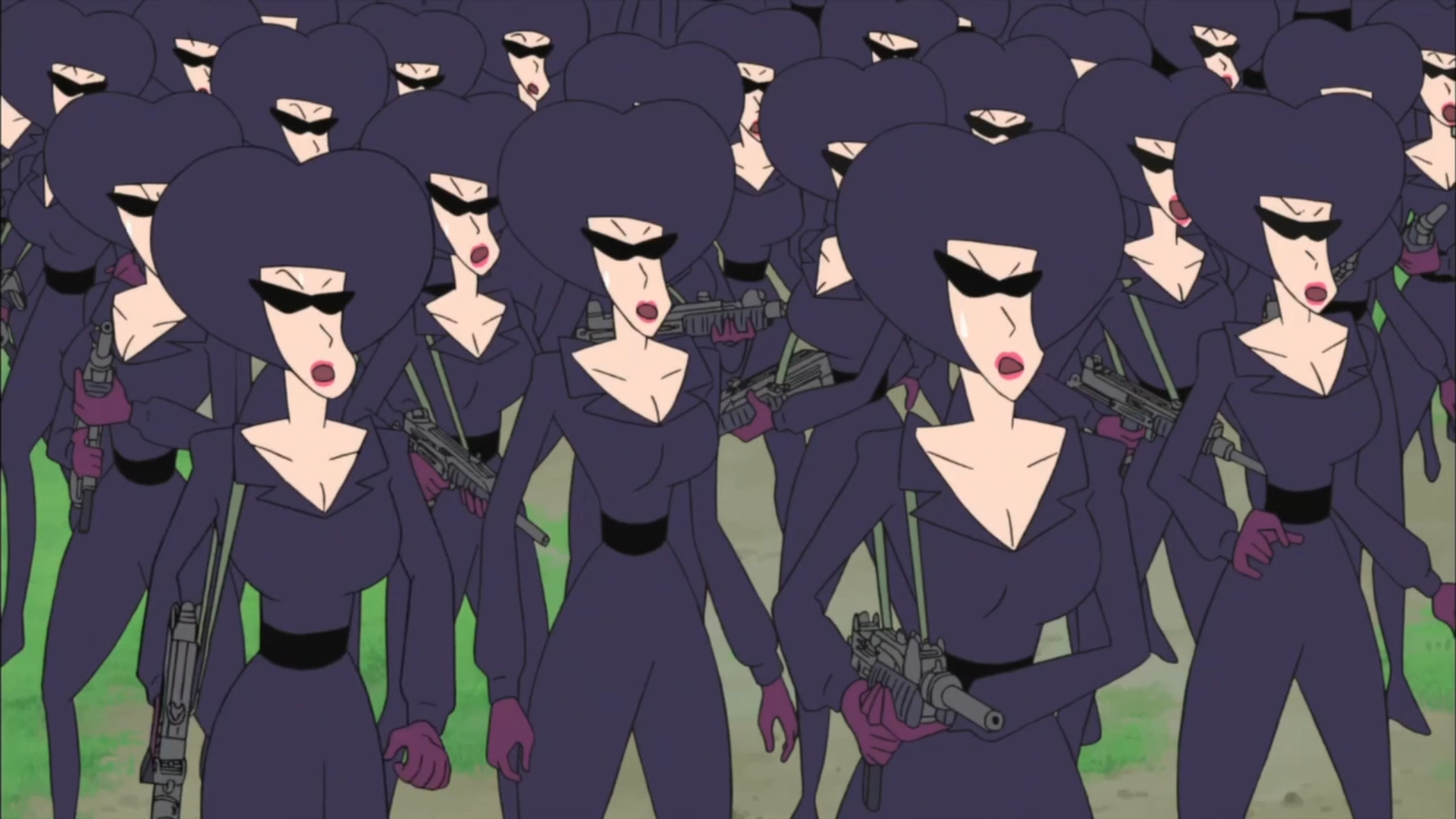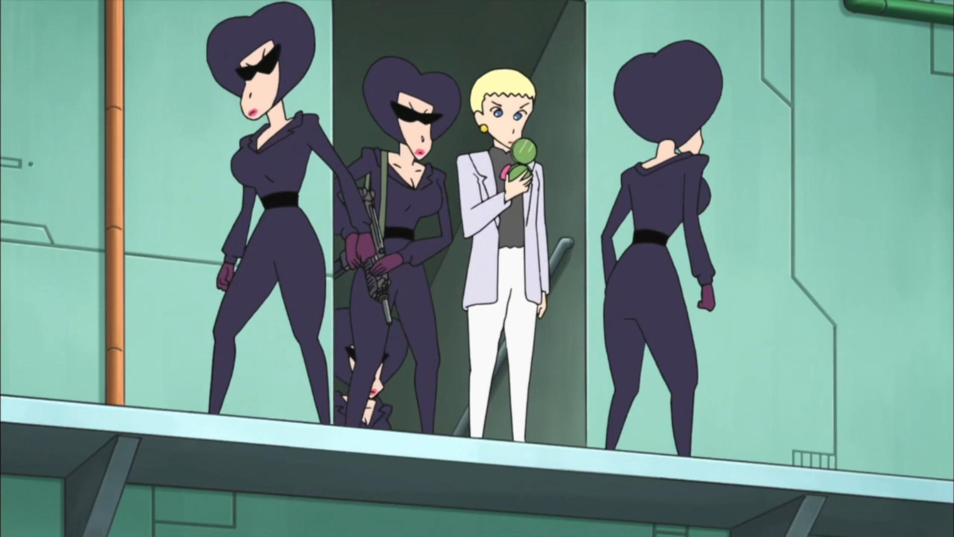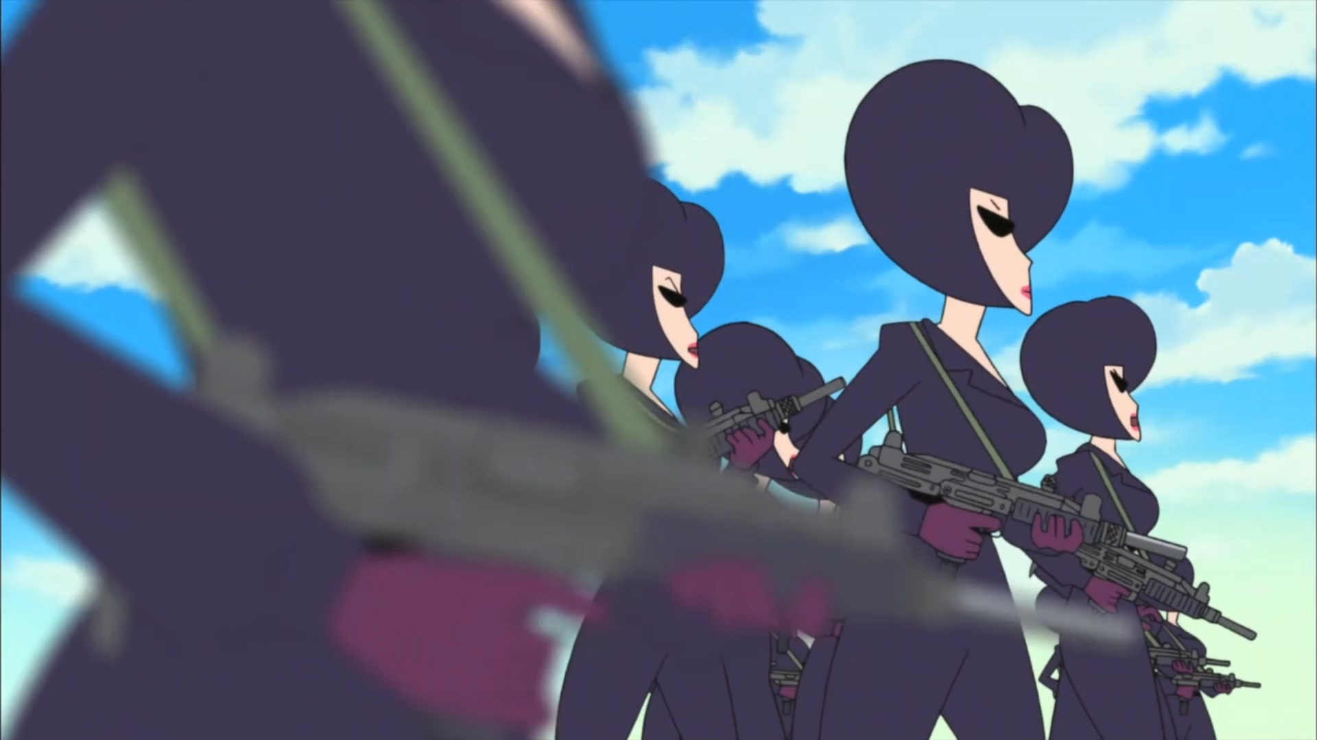 I think I never saw them posted here before, so from the 19th Crayon Shin Chan film (Crayon Shin-Chan: Fierceness That Invites Storm! Operation Golden Spy) Two vilain want to destroy the world and are accompanied by zako with a rather silly design but I love it...They are defeated by a giant...fart...still love them ha ha