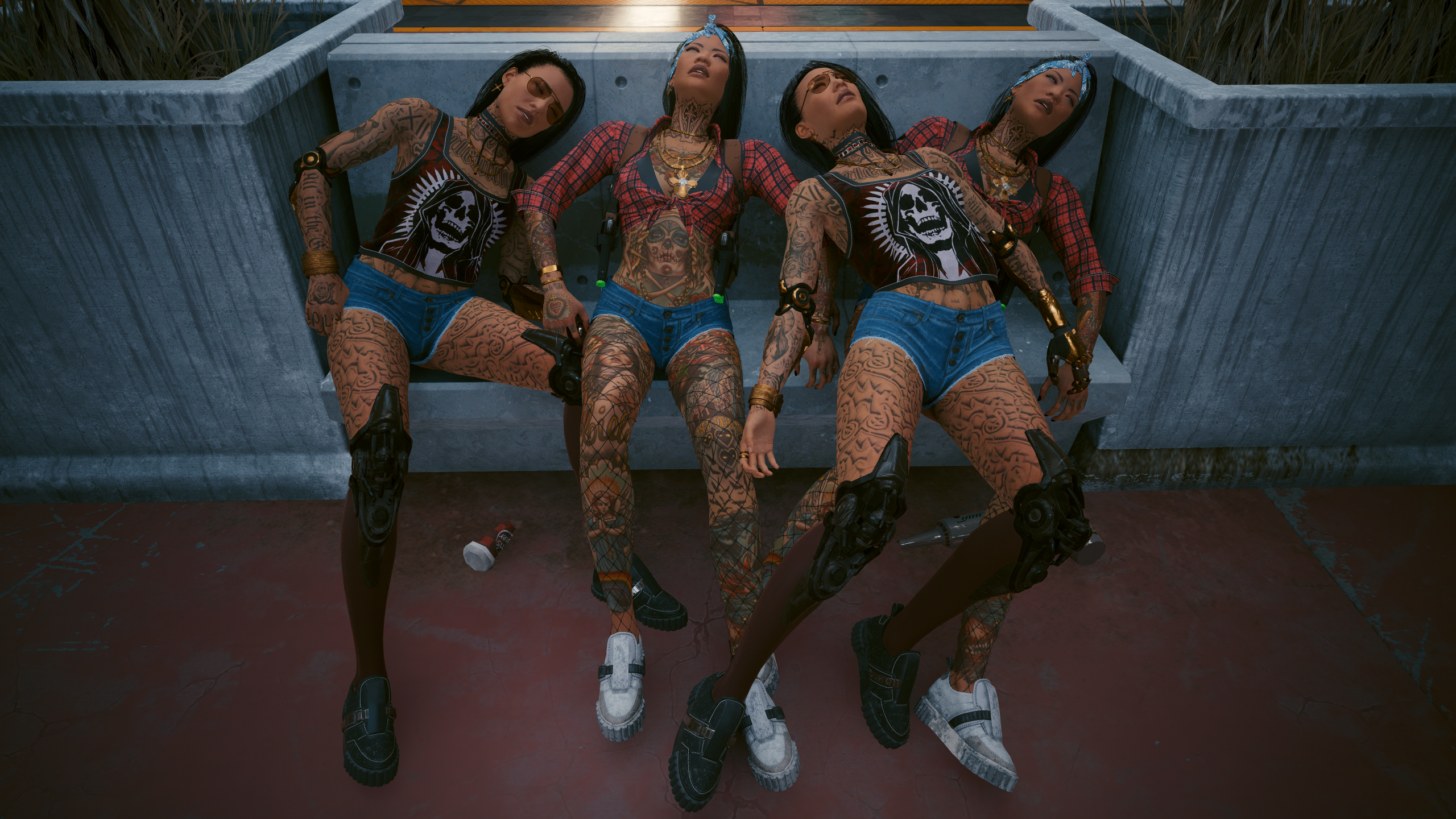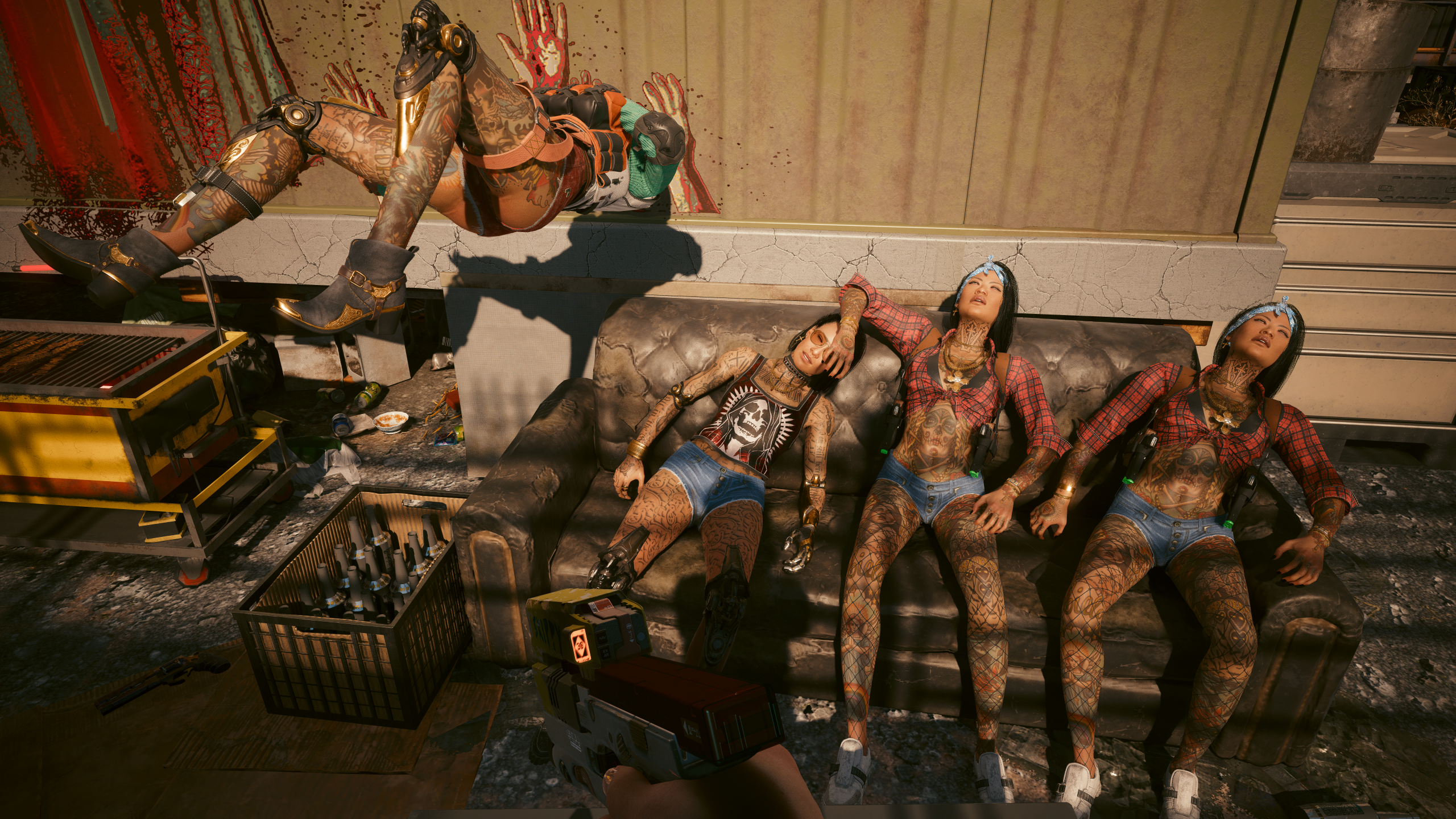 Some fun with the Valentinos gang in Cyberpunk 2077. Non-lethal methods were used. I dunno why the one zako is floating, but she did not want to cooperate for the picture. The first time, she fell through the couch.